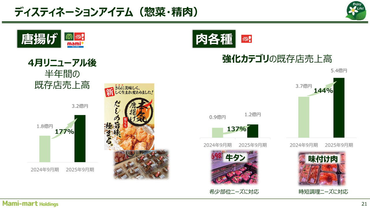 まずは、商品開発についてです。現在、特に生鮮商品の開発を強く考えています。これは惣菜部門に関する取り組みで、彩裕フーズという惣菜会社で生産している唐揚げを、地域一番の唐揚げにしようというかたちで、4月にリニューアルしました。その結果、売上高は177パーセントに伸長しています。