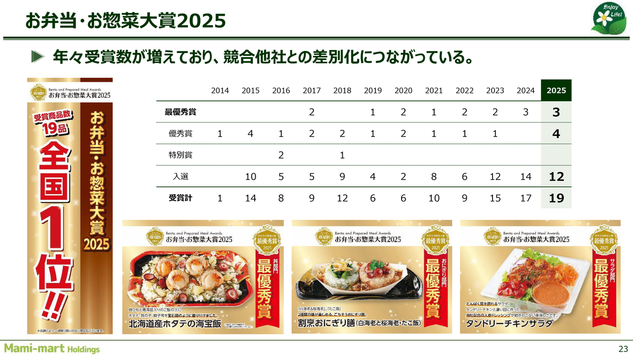 お弁当・お惣菜大賞についてです。今年2月には19アイテムが受賞しました。その中で、11カテゴリ中、最優秀賞が3つ、優秀賞が4つという結果でした。今回特徴的だった点は、お弁当・お惣菜大賞のカテゴリが全部で11カテゴリある中で、すべてのカテゴリで入賞を果たしたことです。これは、この企画としても初めての成果です。