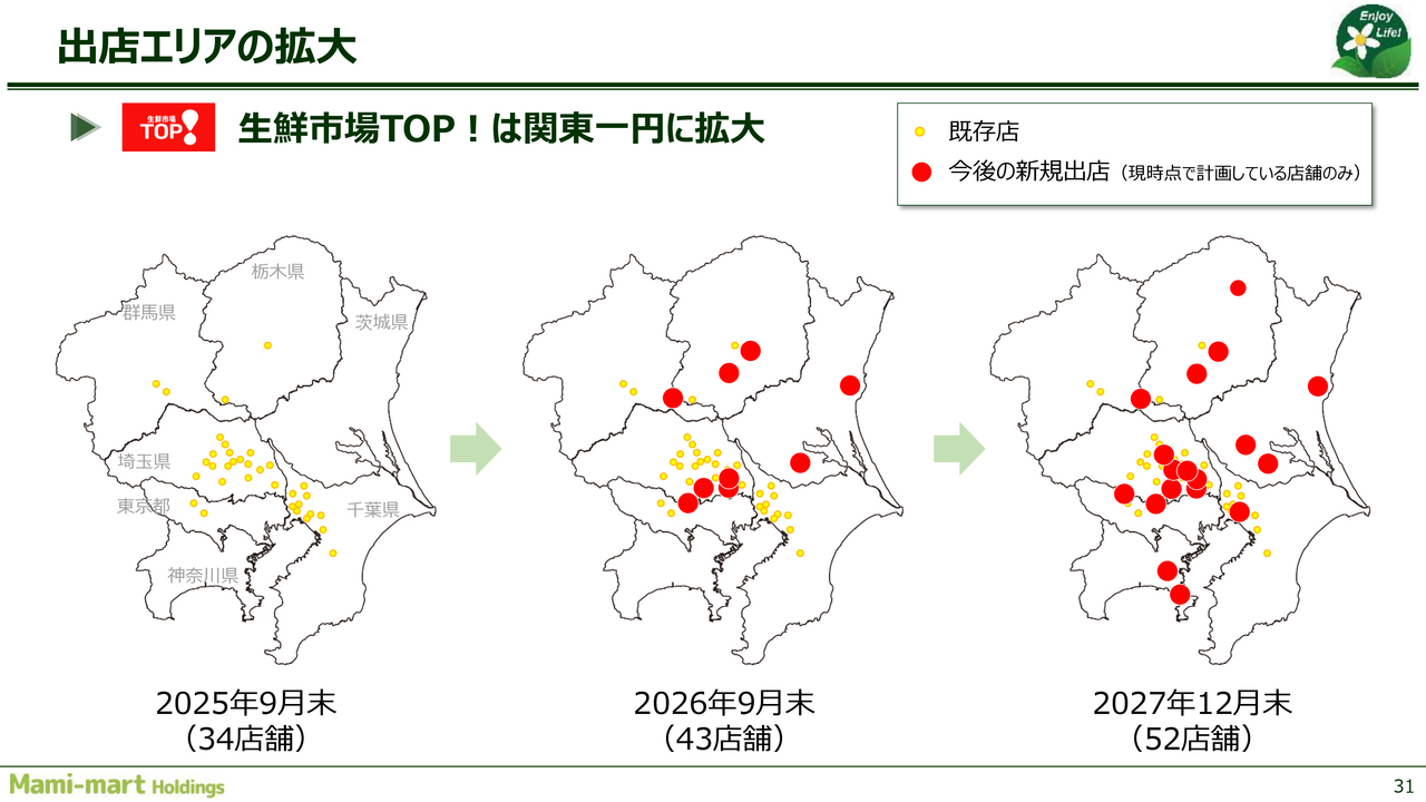 質問者:今後の業態展開について、すべて「生鮮市場TOP!」だというお話がありました。スライド31ページに、2026年9月末時点でオープン予定のエリアが記載されています。埼玉県と東京都の境目に1ヶ所丸がついていますが、これは東京都なのか埼玉県なのか教えていただけますでしょうか?