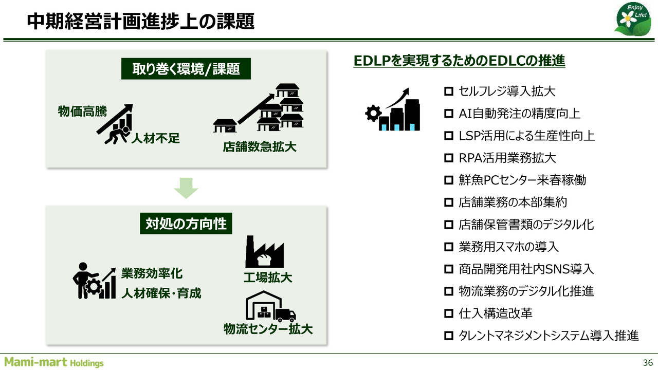 中期経営計画進捗上の課題についてです。中期経営計画はあと1年を残していますが、物価の高騰や人材不足、さらに弊社内部では店舗数の急拡大に伴うさまざまな問題が生じています。これらの課題に対応するため、業務の効率化を進めるとともに、先ほど触れた人材の確保や育成をさらに強化していきます。