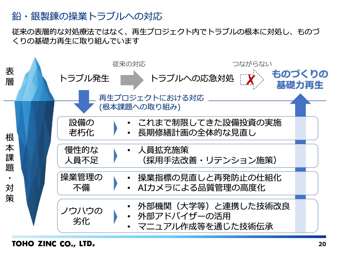 また、設備関係については、長年、当社には欠損事業である鉱山事業があり、国内工場の整備に手が回らなかったという背景があります。これが、トラブルに結びついたと考えています。