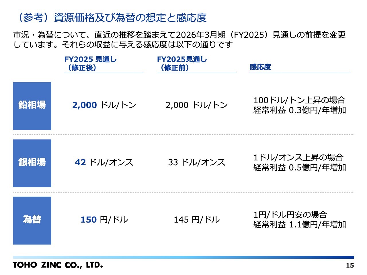 この修正の要因は、鉛・銀製錬事業での操業トラブルや小名浜製錬所で発生した火災による一過性損失です。ただし、現在の銀相場の歴史的高騰や円安の進行は当社にとって追い風となっており、為替及び相場の変動によっては修正見通しにプラスに寄与する可能性があると見込んでいます。