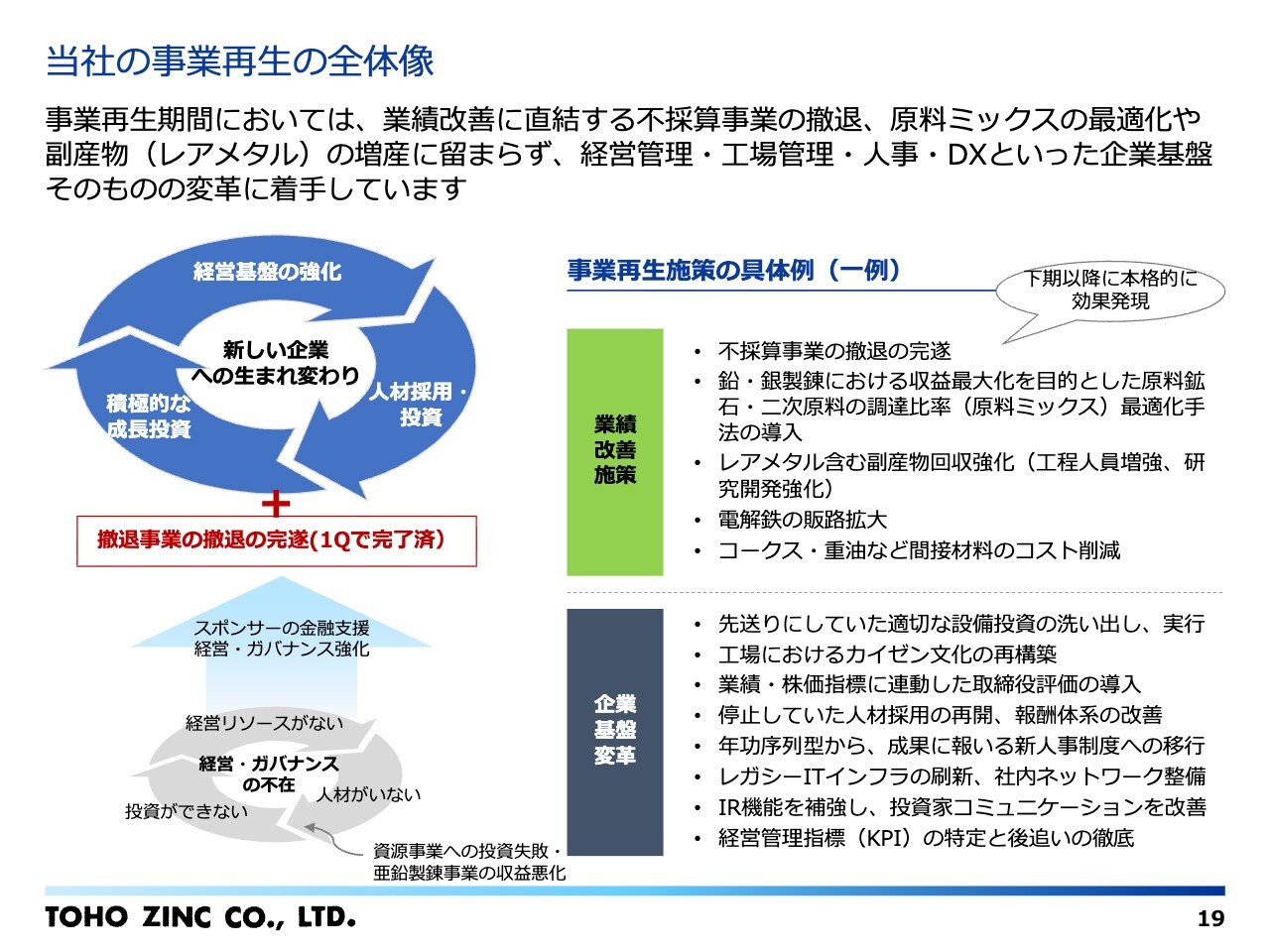 本決算について社長として率直に申し上げると、事業再生計画期間の当初に計画していた亜鉛製錬事業の残務費用計上などにより、当期純損失となっていますが、第1四半期から第2四半期にかけて四半期ベースでは収益が改善しており、損失のボトムから下期以降の黒字化に向けた体制が整ったものと考えています。