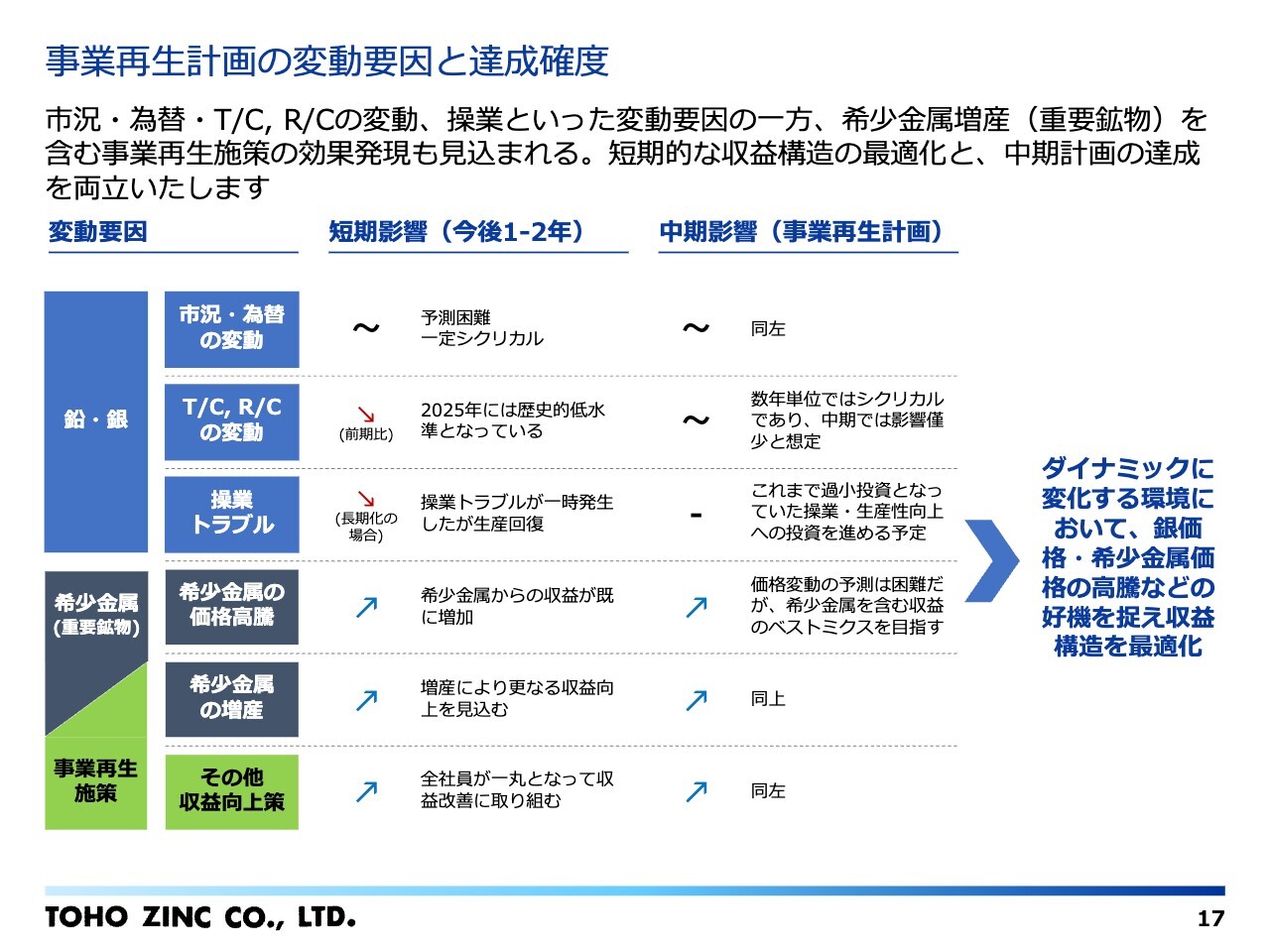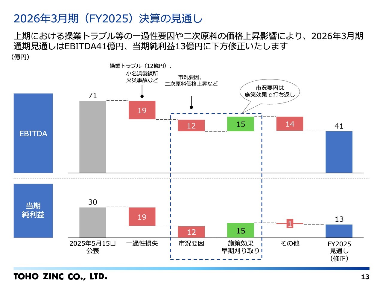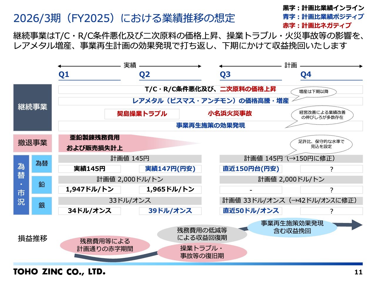 当社は、本年度より事業再生期間を設定しています。事業再生施策としてすでに実行した全社的な収益改善への取り組みは、下期に向けて着実に効果を発揮する見込みです。これに加え、銀をはじめとする貴金属や希少金属の価格が歴史的に高騰している現状や、亜鉛製錬事業の残務費用が下期には軽減されることを踏まえると、下期には大幅な業績改善が見込まれます。
