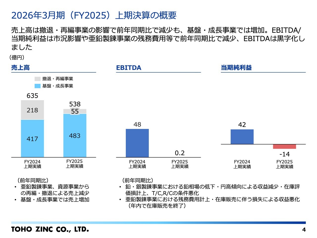 【QAあり】東邦亜鉛、EBITDA黒字化で業績は回復傾向、収益改善施策が進展 市況高騰や残務費用軽減を追い風に下期は反転攻勢へ