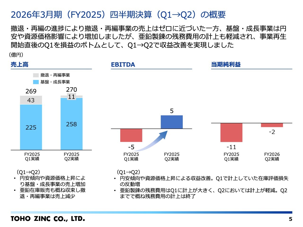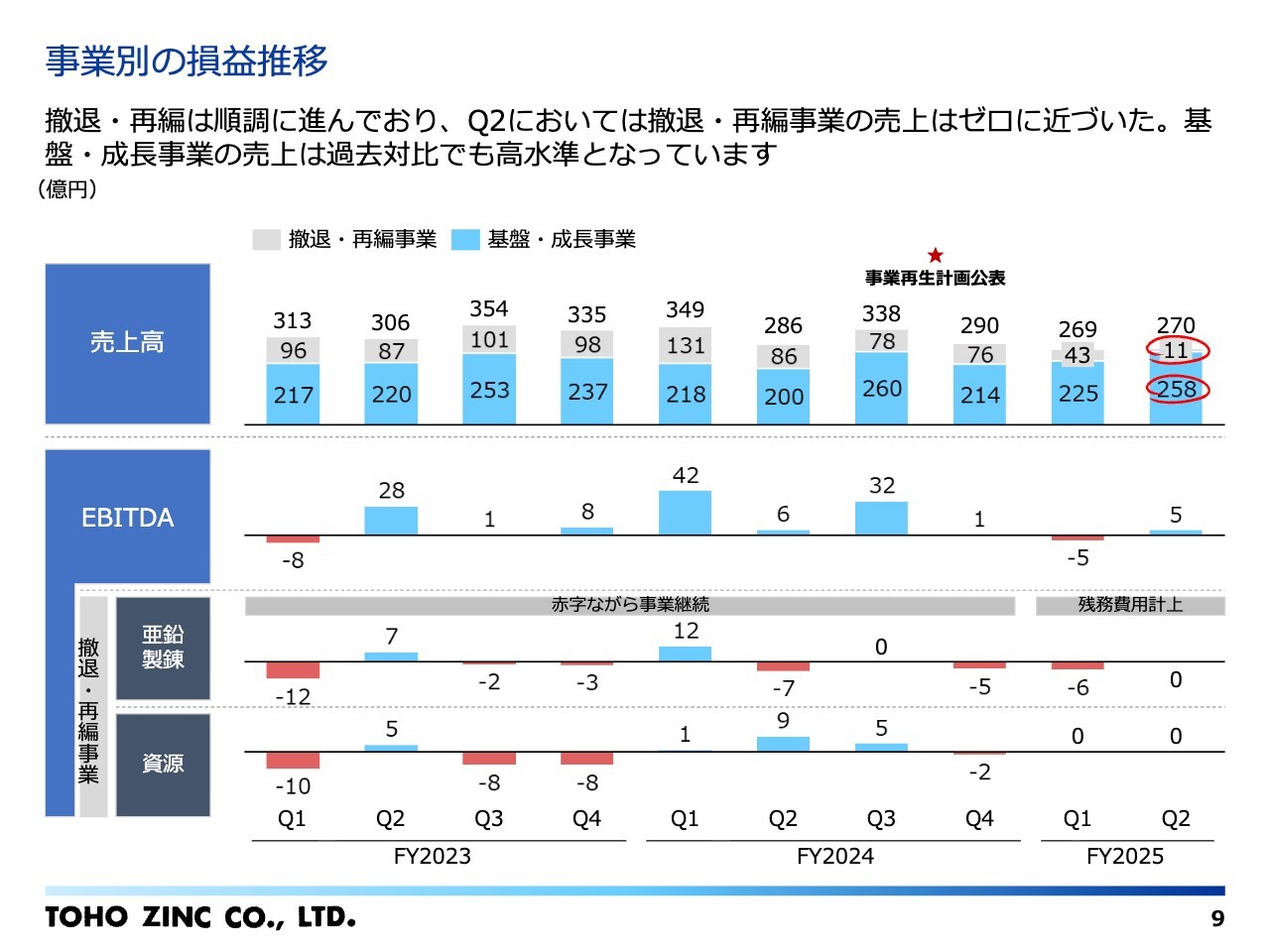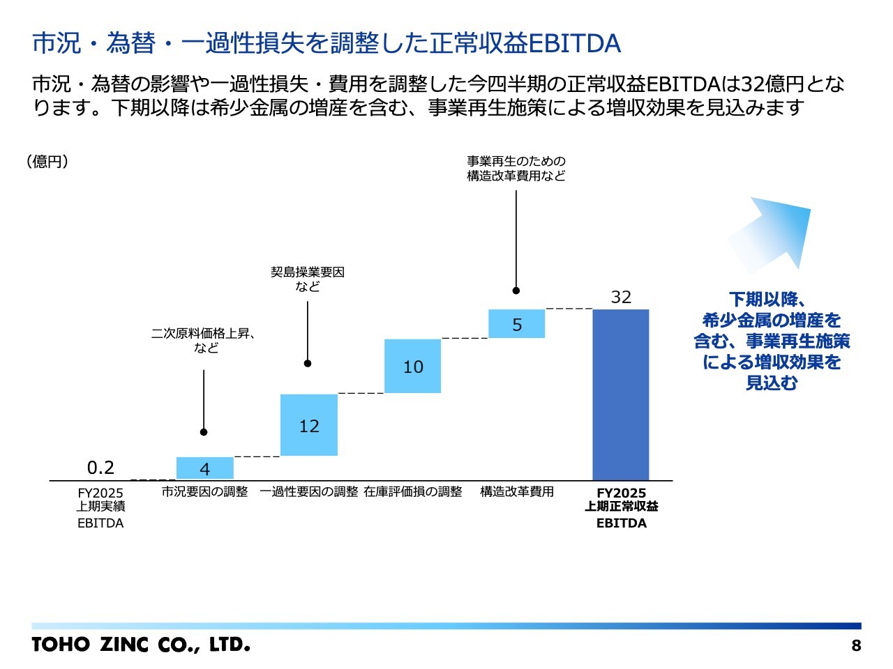 四半期の収益が改善した背景としては、亜鉛製錬事業の残務費用計上の軽減が進んだことや、再生施策の一部で早期に効果が表れていることが挙げられます。これらを踏まえ、一過性費用などを除いた正常収益ベースでの半期EBITDAは約32億円と考えています。