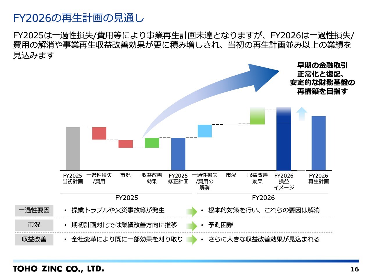 今回の下方修正により、事業再生の初年度が計画未達となりますが、次年度の2026年度の見通しについては、スライドの図の下部にある3つの項目にも記載のとおり、今年度の一過性要因として認識している操業トラブルや火災事故の影響が解消される見込みです。