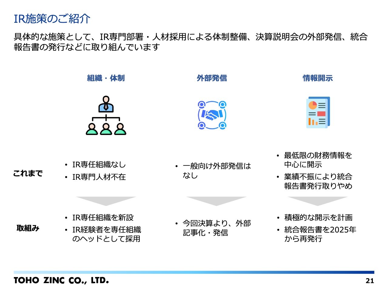 スライド左側に記載のとおり、当社ではこれまでIR専任組織が存在せず、本説明会のように四半期ごとの決算報告を実施するにとどまっていました。しかし今年中にIR専任組織を新設し、組織・体制面を整備する予定です。