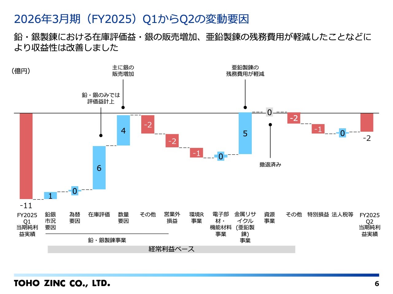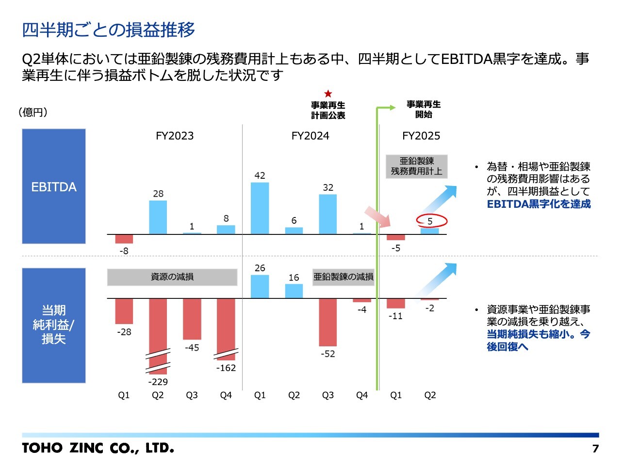 EBITDAについては、第1四半期に発生していた在庫評価損失が、第2四半期の製品売却などにより縮小したことや、亜鉛撤退費用の軽減により5億円の黒字となりました。また、当期純損益は2億円の損失ながらも、改善が見られました。