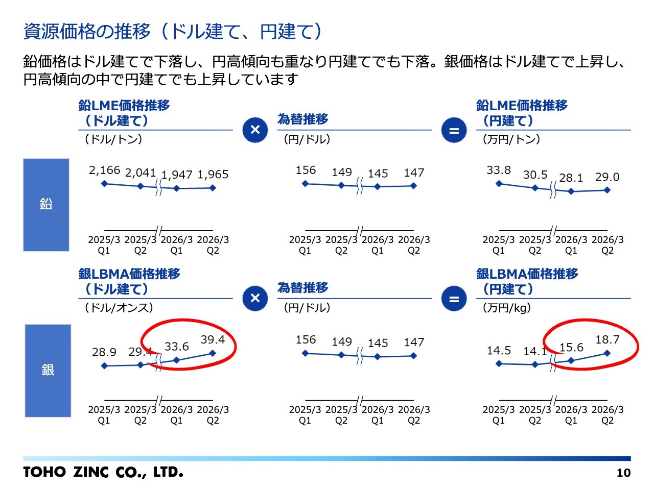 資源価格と円建て換算価格の状況についてです。スライドの図の中央にあるドル円為替推移をご覧いただくと、前年度の上期と比較して円高となっています。また、前年度対比の資源価格については、上段の鉛がドル建てで2,100ドル近辺から1,900ドル台半ばまで下落し、それに伴い円建て価格も下落しています。