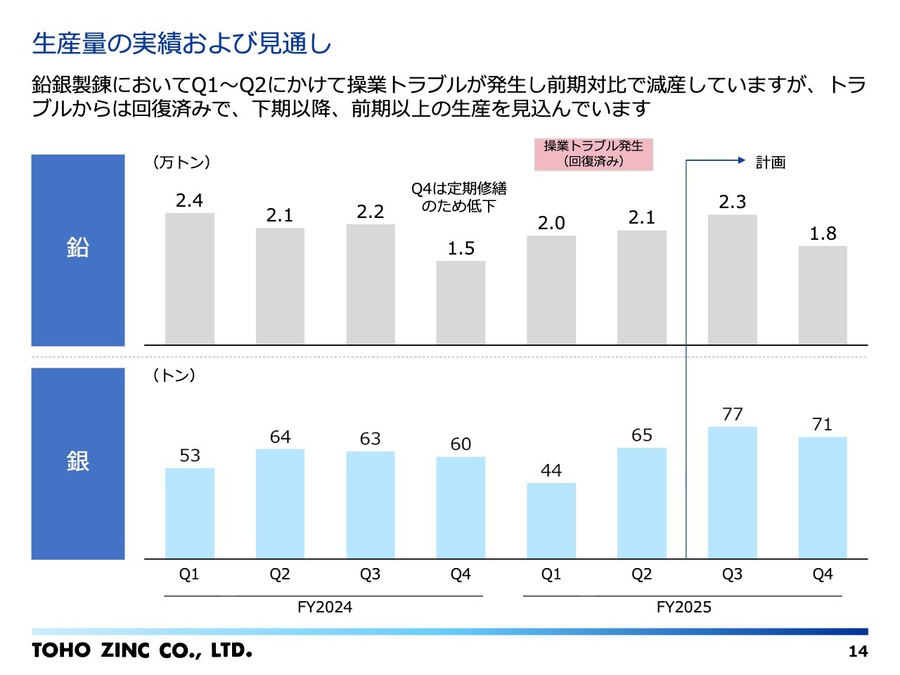 鉛と銀の生産量についてです。今年度上期は昨年度と比較して減産となりましたが、操業トラブルは順次回復しており、再発防止の取り組みも進めています。第3四半期以降はスライドに記載の青線右側のとおり、前年度を上回る生産量を見込んで修正計画を作成しています。