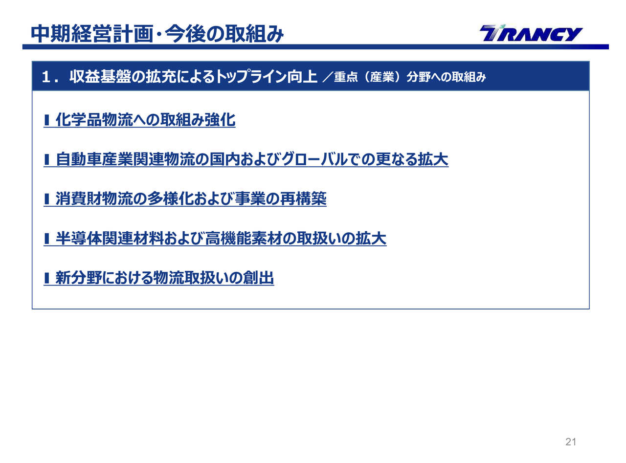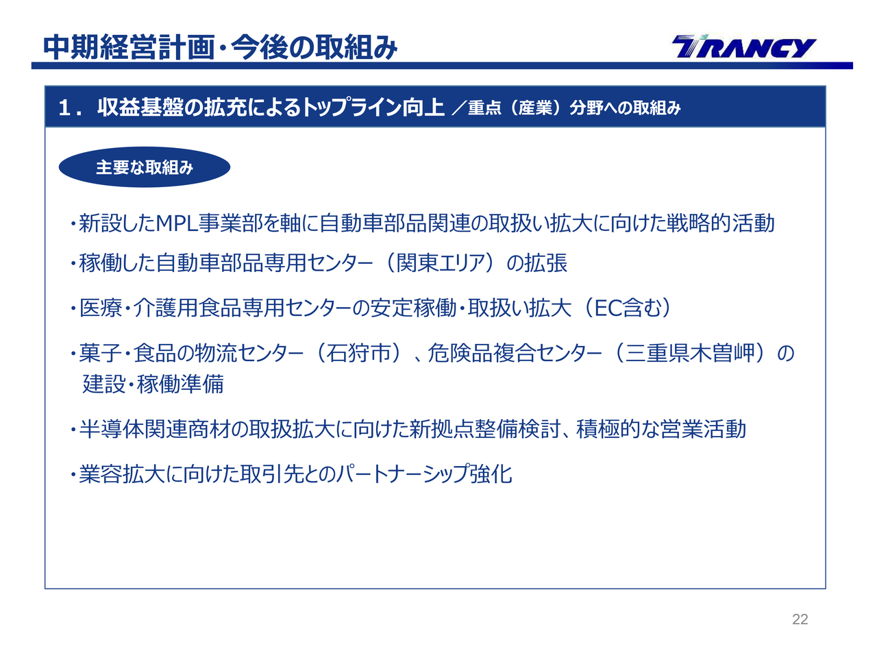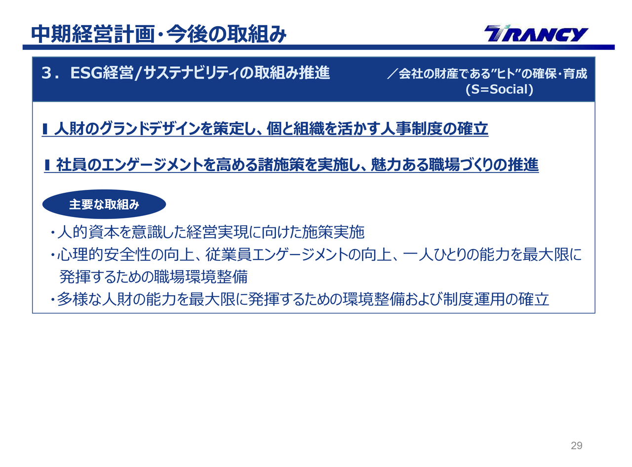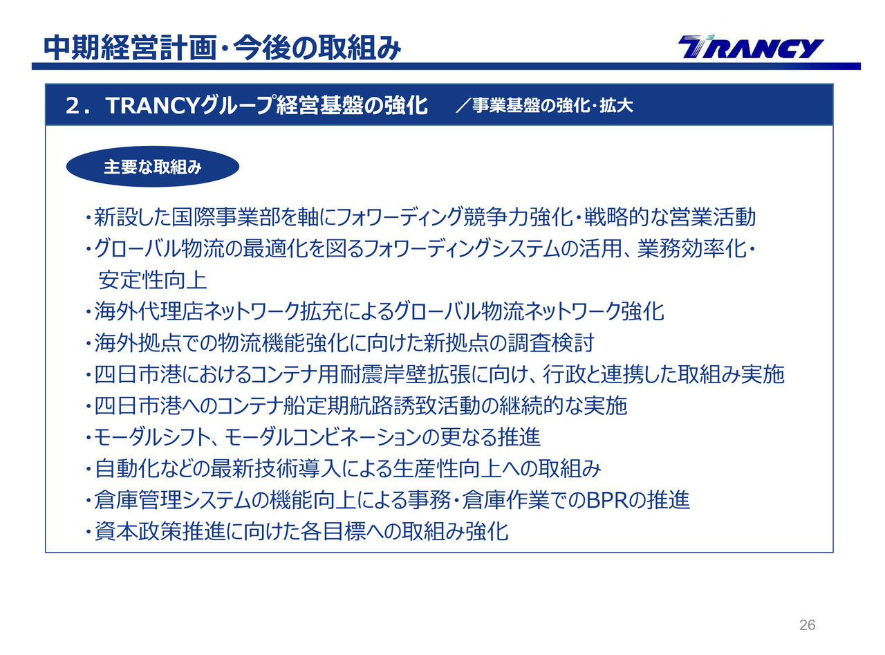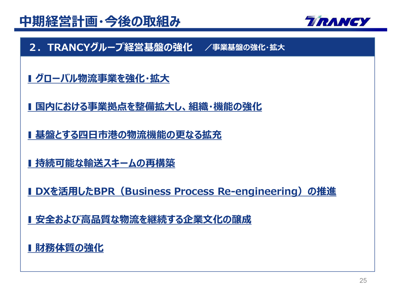 2つ目は、TRANCYグループ経営基盤の強化です。スライドに記載の7項目に沿って取組みを進めていきます。