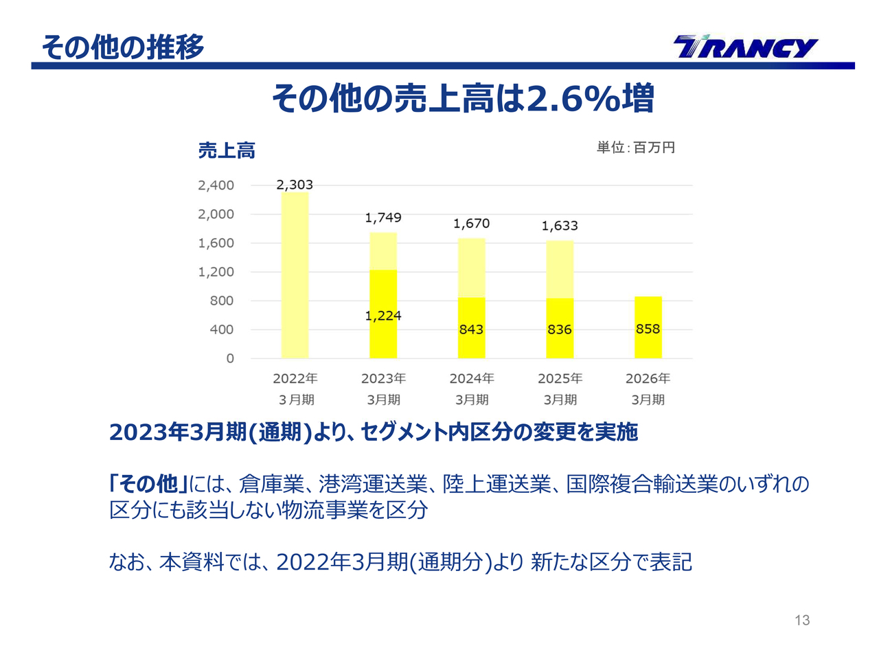 総合物流事業におけるその他の売上高は、前年同期比2.6パーセント増の8億5,800万円となりました。場内での付帯作業の取扱量が増加しました。