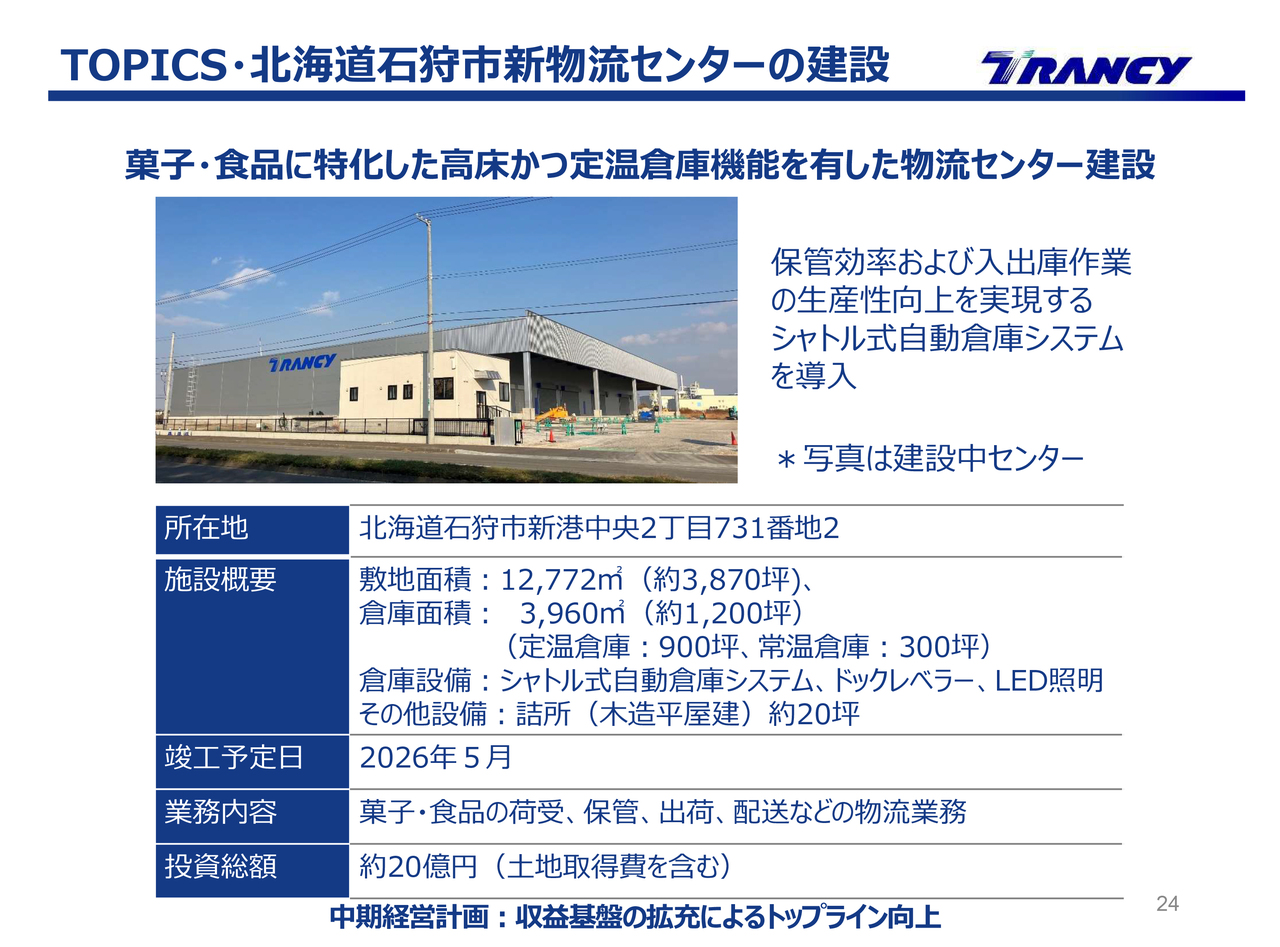 北海道石狩市に建設中の菓子・食品の物流センターについては、来年5月の竣工に向けて着実に取り組むとともに、早期の収益化を目指して新規の営業開発を進めていきます。三重県桑名郡木曽岬町に整備予定の危険品複合センターについても、建設の着工に向けた取組みを着実に進めていきます。