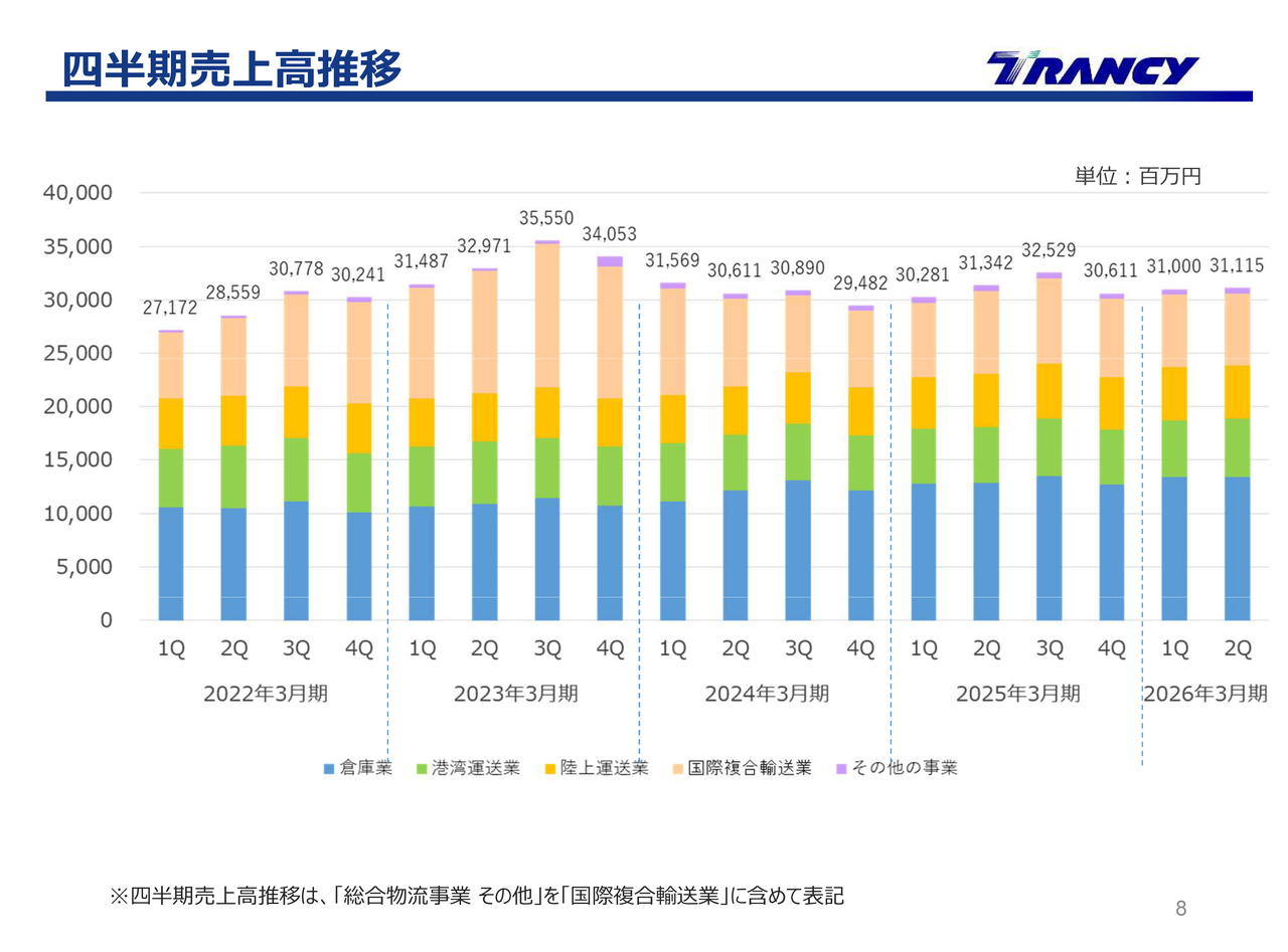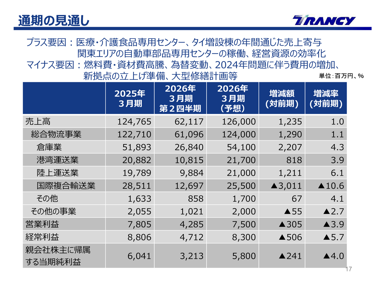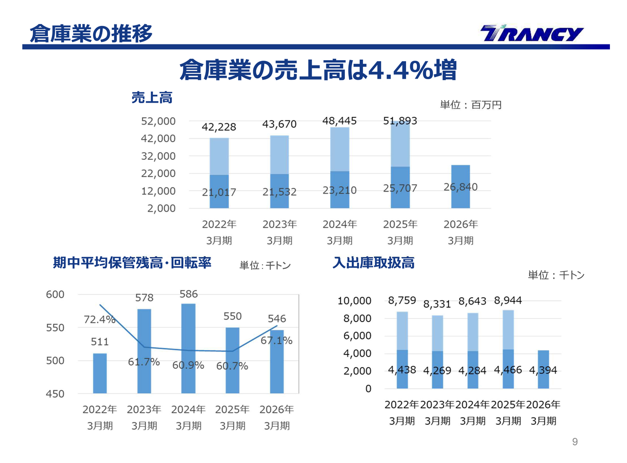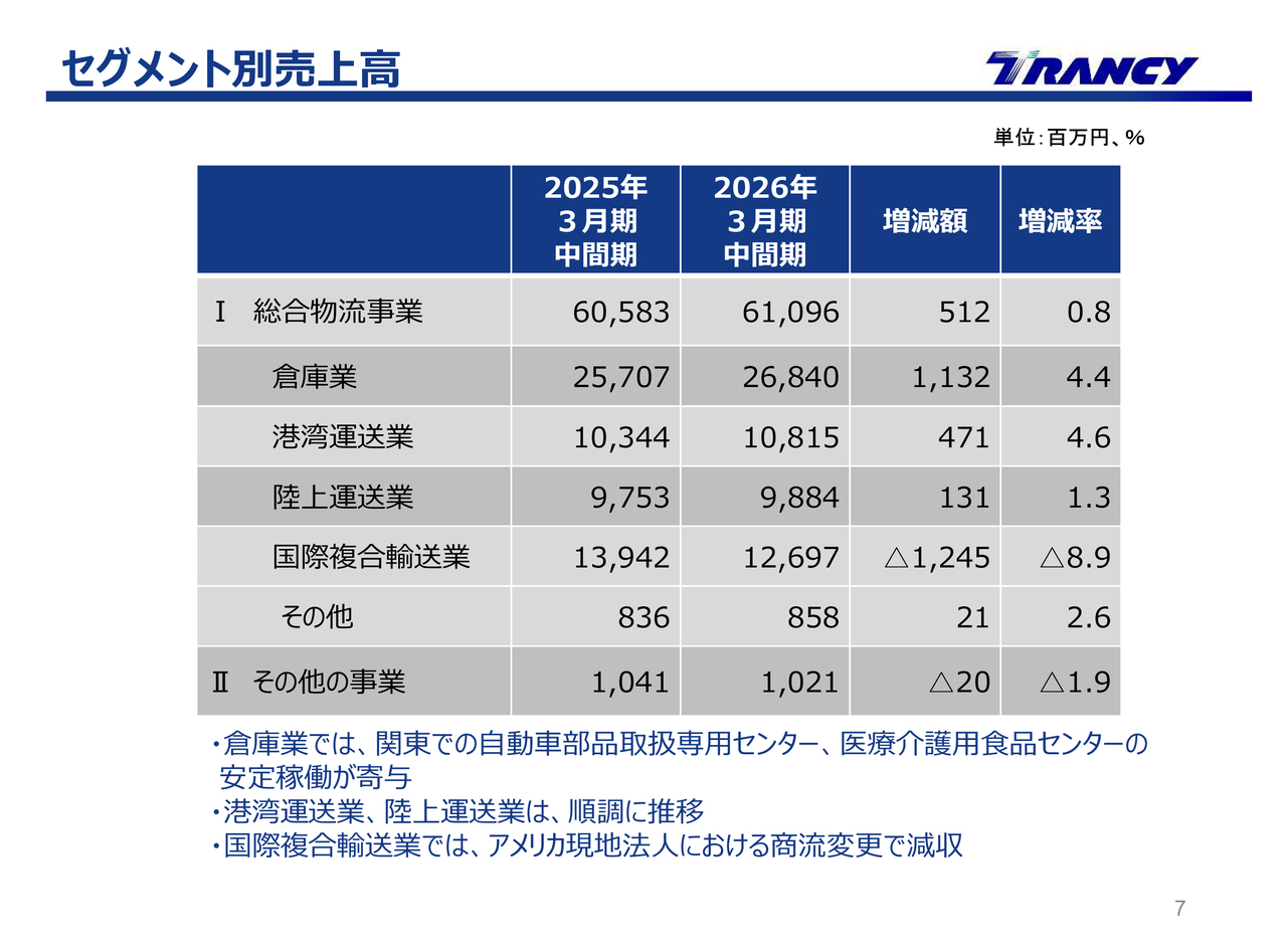 先ほどの決算ハイライトでも触れたように、国際複合輸送業では減収の影響がありました。一方、倉庫業では関東地区の自動車部品取扱専用センターや医療・介護用食品専用センターなどの計画的な投資による新拠点の整備や、その後の早期安定稼働が増収に寄与しました。
