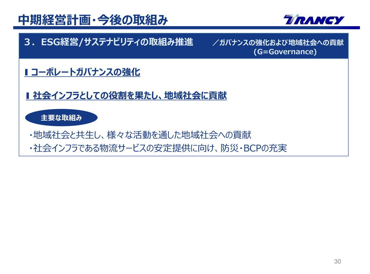 ESGの「G」についてです。ガバナンスの強化および地域社会への貢献においては、2つの項目に沿って取組みを進めていきます。