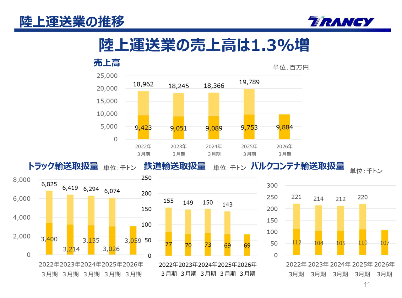 陸上運送業の売上高は、前年同期比1.3パーセント増の98億8,400万円となりました。主力であるトラック輸送の取扱量は増加しましたが、鉄道輸送やバルクコンテナ輸送の取扱量は減少しました。