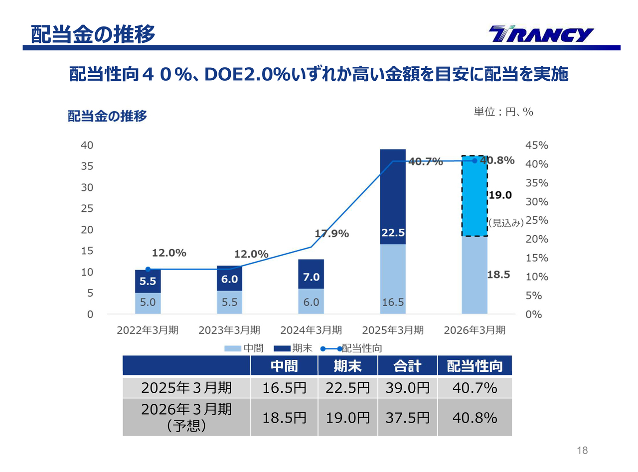配当金についてです。2025年5月13日に開示した内容のとおり、配当性向40パーセントの方針に基づき、中間配当金は1株につき18円50銭、期末配当金は1株につき19円を予定しています。