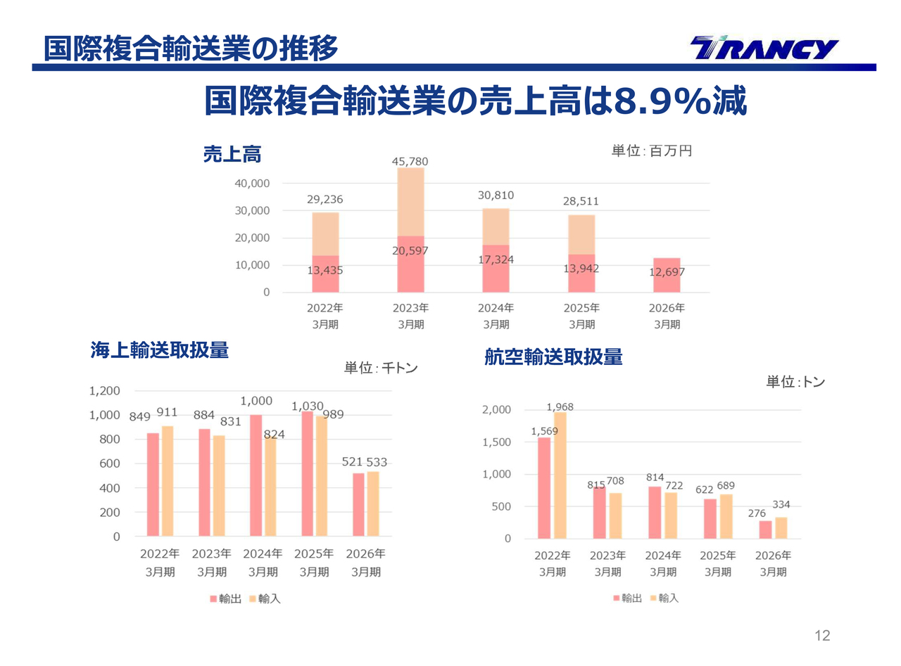 国際複合輸送業の売上高は、前年同期比8.9パーセント減の126億9,700万円となりました。海上輸送と航空輸送の取扱量は増加した一方で、海外現地法人における取扱量は減少しました。