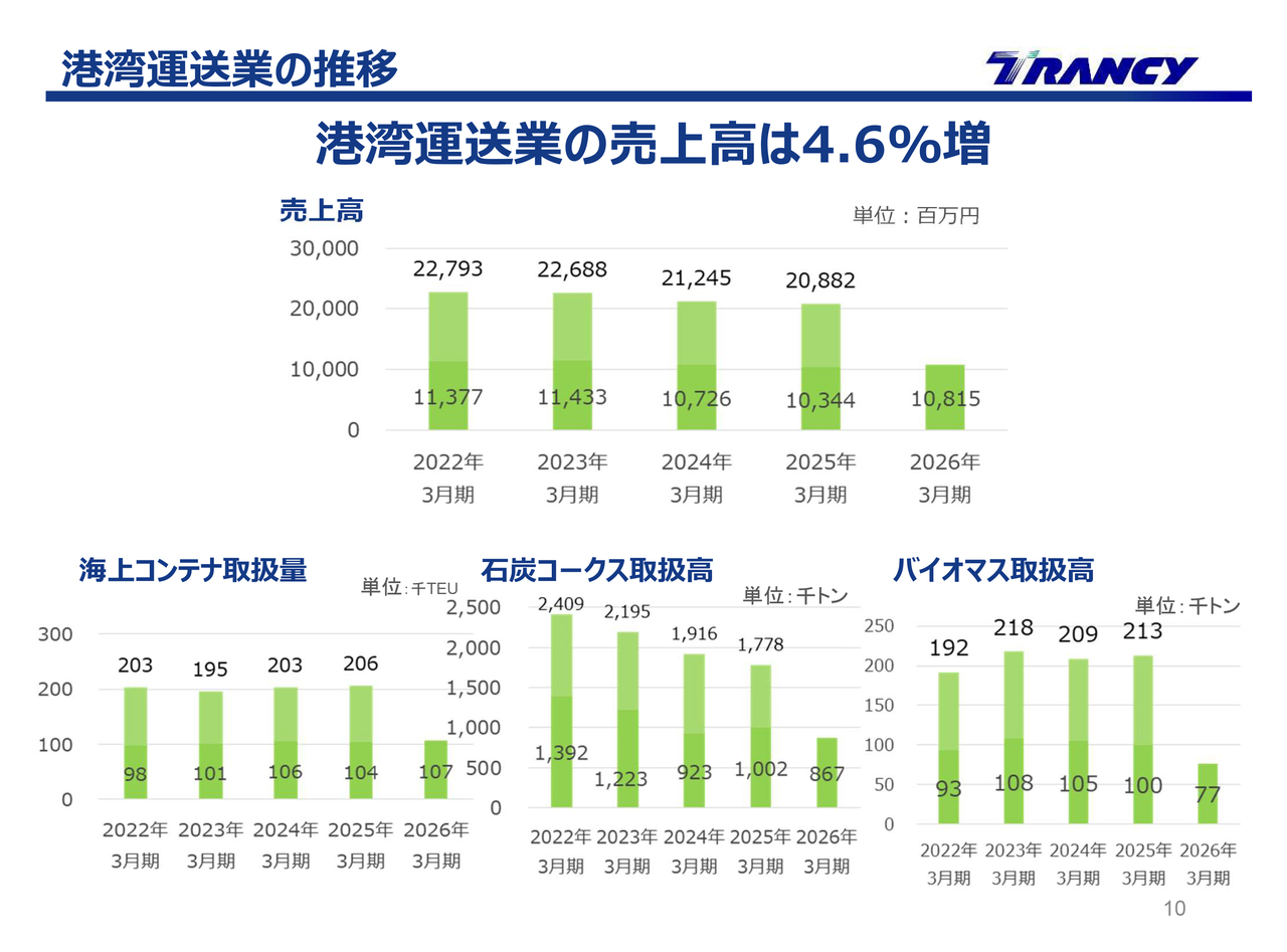 港湾運送業の売上高は、前年同期比4.6パーセント増の108億1,500万円となりました。四日市港における海上コンテナの取扱量は増加しましたが、完成自動車、石炭・オイルコークス、バイオマス燃料の取扱量は減少しました。