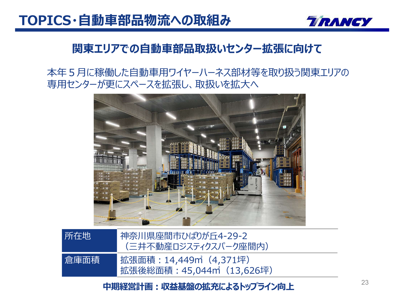 本年2月に神奈川県座間市に東京支店座間営業所を開設し、5月からお客さま専用の自動車部品専用センターとして稼働させました。物流の効率化や適正化を図るため、拠点の規模やスペースを拡張することとなりました。