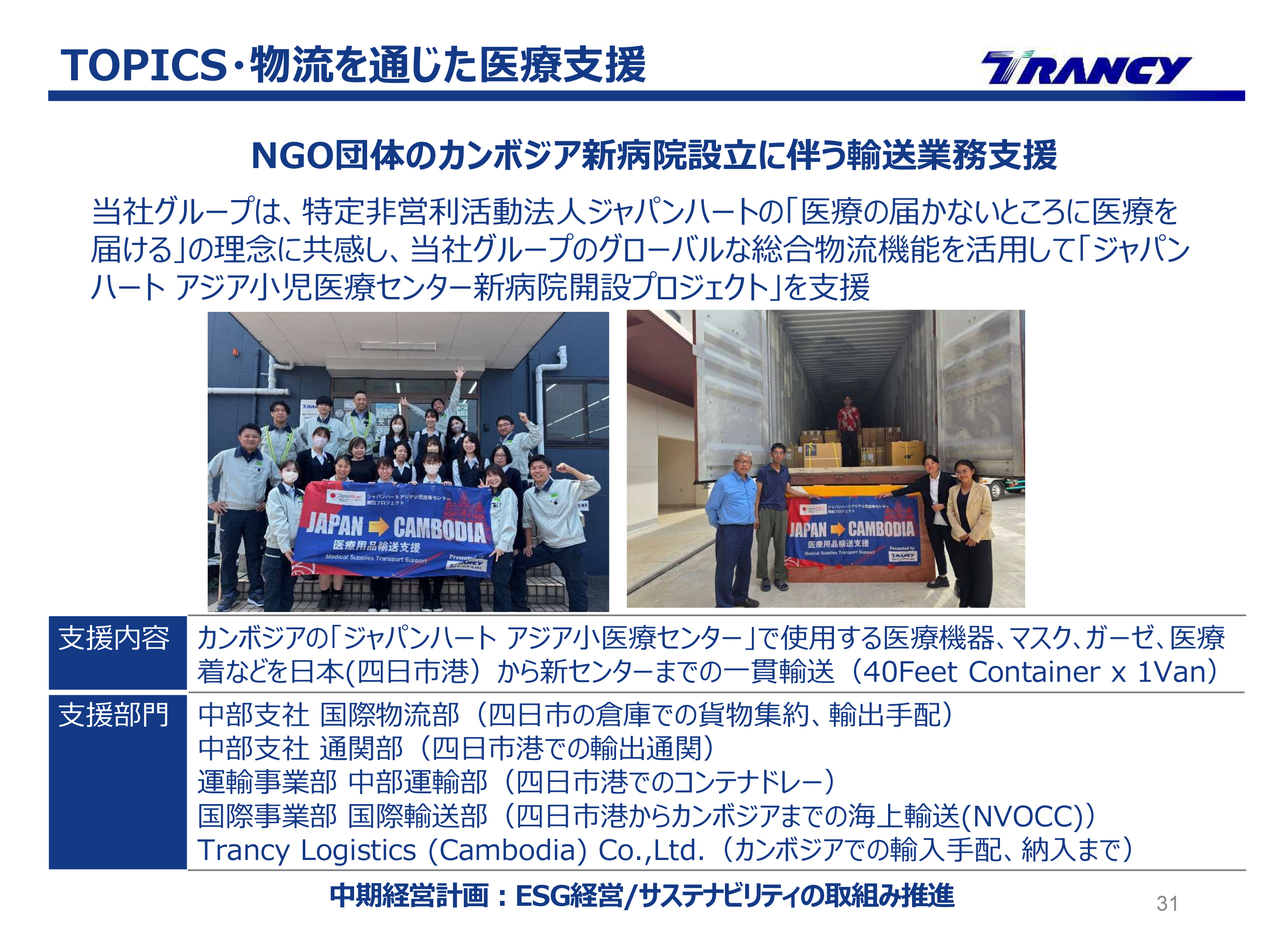 直近のESGの取組みについてご紹介します。物流を通じた医療支援として、特定非営利活動法人ジャパンハートのカンボジア新病院設立に伴う輸送業務支援を実施しました。