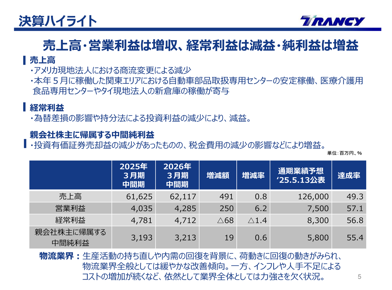 当中間期の決算ハイライトです。