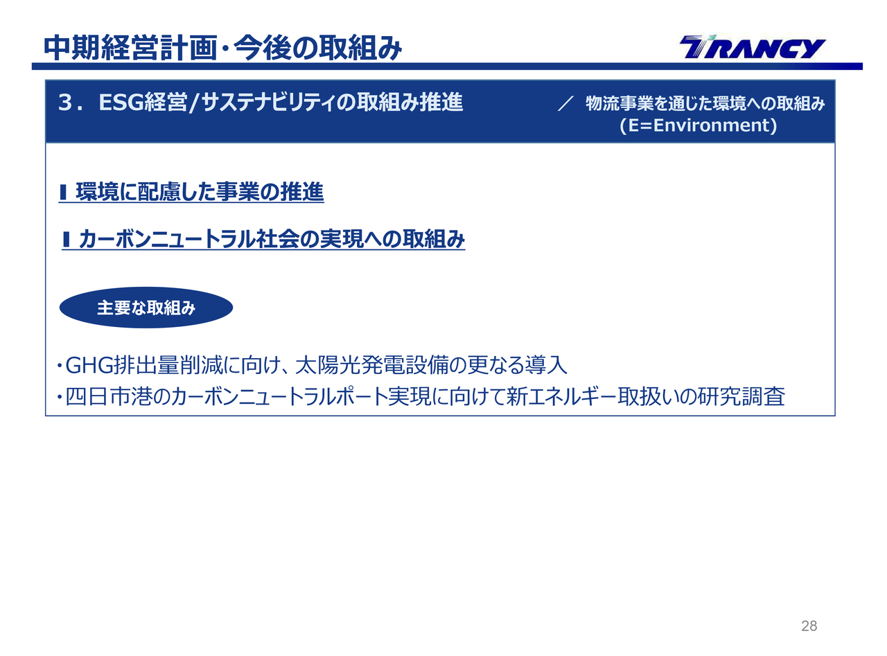 3つ目は、ESG経営/サステナビリティの取組み推進です。ESGの「E」にあたる物流事業を通じた環境への取組みについては、2つの項目に沿って進めていきます。
