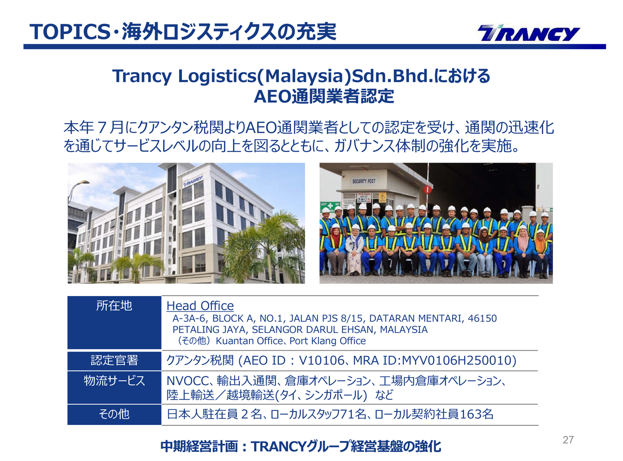 直近の取組み事例をご紹介します。海外ロジスティクスの充実について、Trancy Logistics(Malaysia)Sdn.Bhd.がAEO通関業者の認定を受けました。