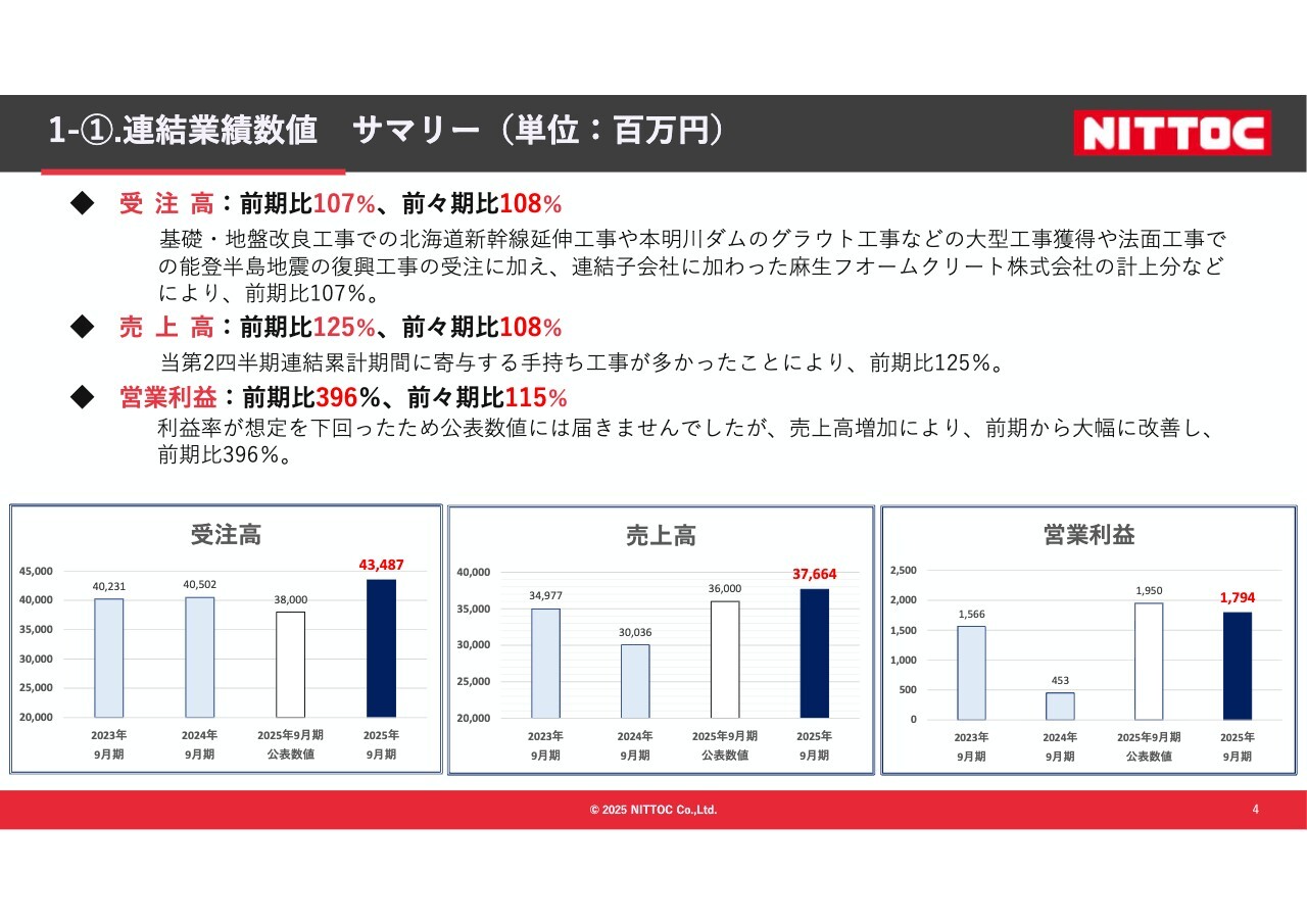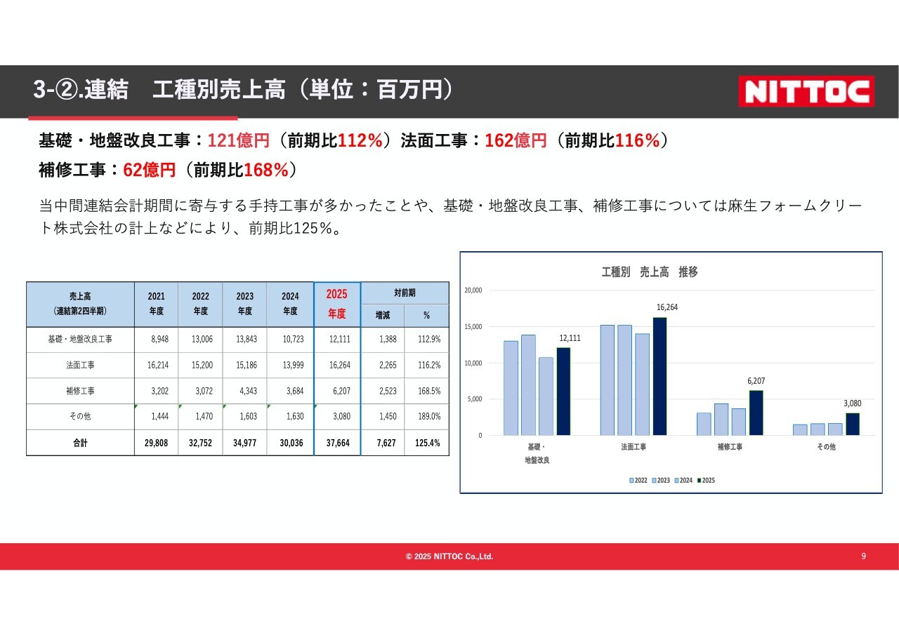 また、補修工事については、2025年4月からグループ会社に迎え入れた麻生フオームクリート株式会社の気泡コンクリート事業が非常に好調です。その業績数値が寄与し、50億1,100万円の受注高を達成しました。