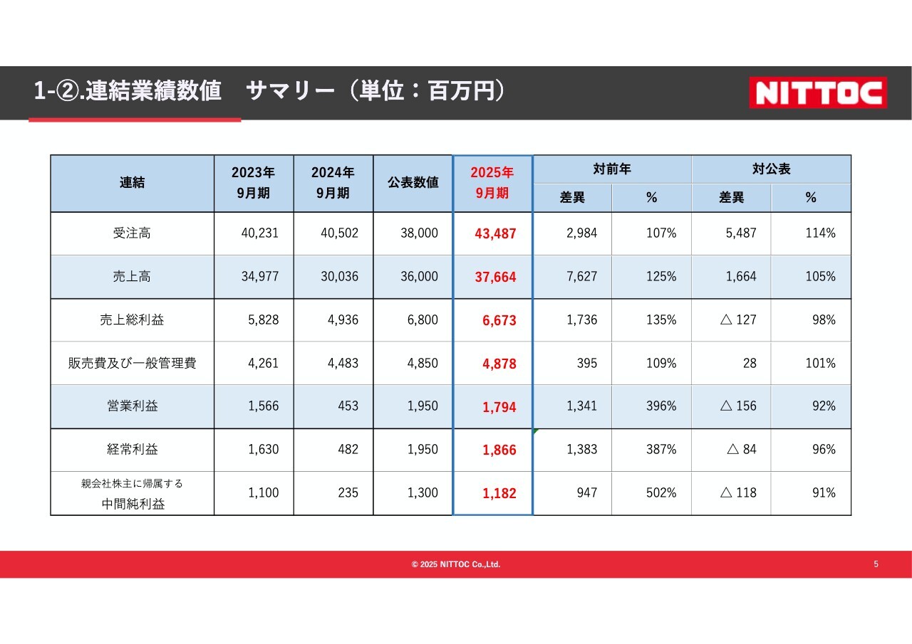 2025年9月期連結業績数値については、スライドの赤文字で示した数値のとおりです。対前年比を上回る数字となり、公表数値についても受注高、売上高ともに上回ることができました。