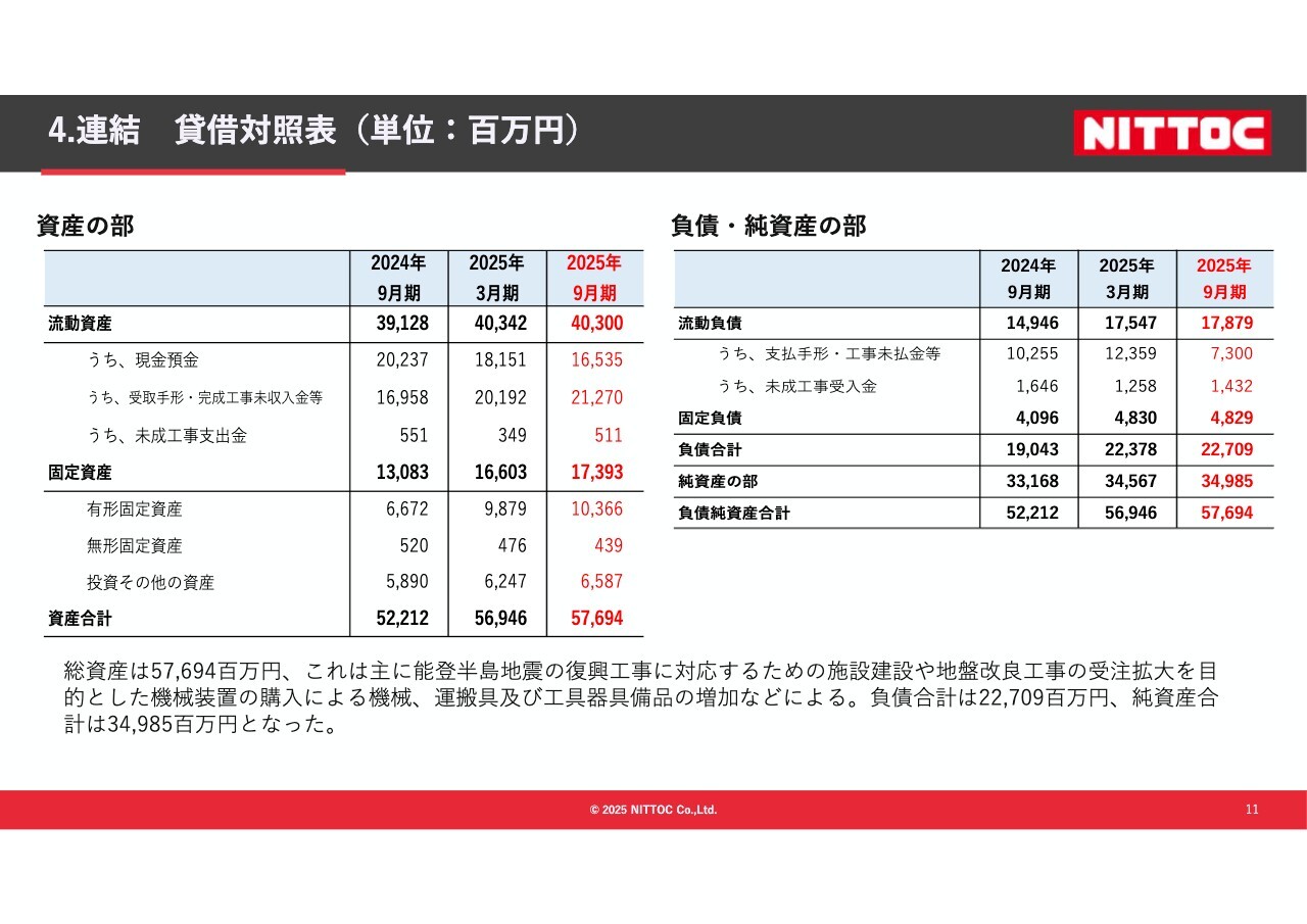 貸借対照表および財務諸表についてご説明します。現預金が減少している理由は、有形固定資産や投資その他の資産が増加したためです。有形固定資産については、能登半島地震の復興工事に対応するための事務所・宿舎の建設や、地盤改良工事を拡大するための大型機械への設備投資が主な要因です。