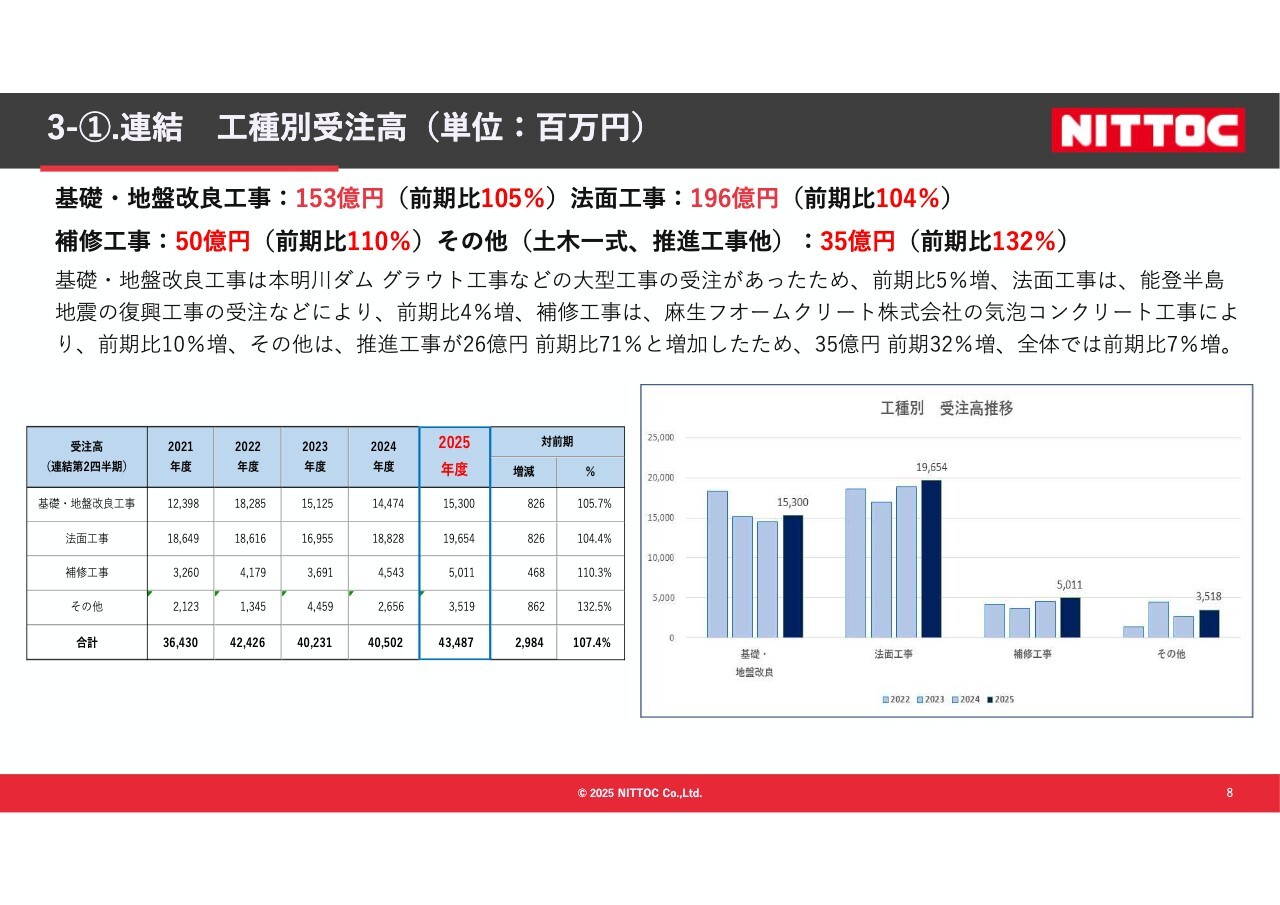 法面工事については、能登半島地震の復興事業に関連した大型工事の受注があり、過去の実績を上回る196億5,400万円の受注高を確保しました。