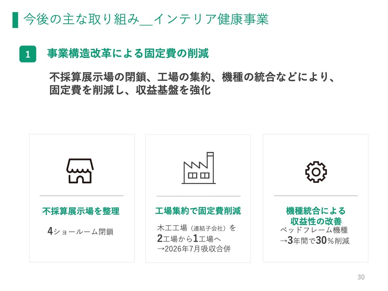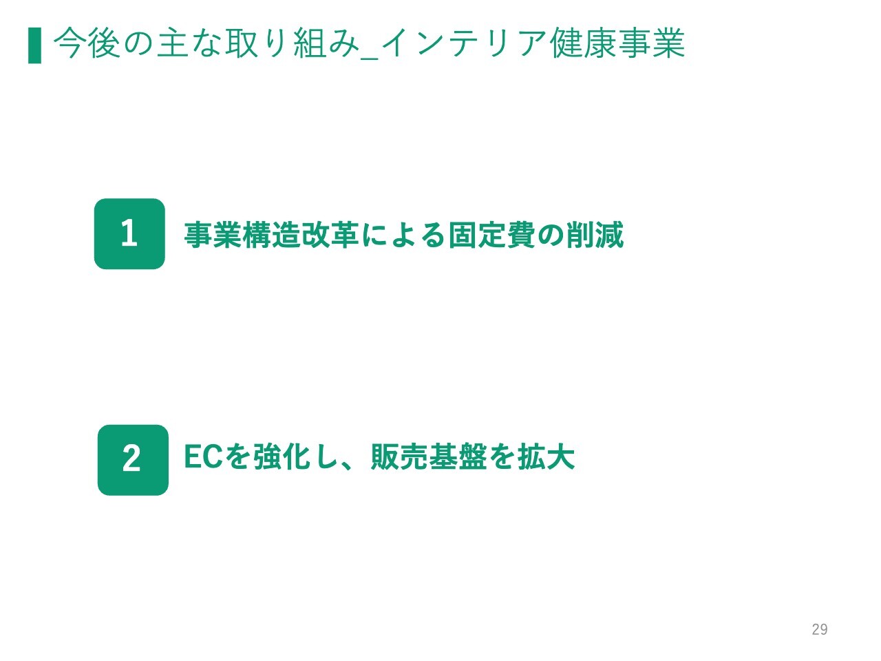 1つ目は、事業構造改革による固定費の削減です。当社のインテリア健康事業では、特に家具店向けのベッド等の卸売事業がインフレによる消費減退の影響を受け、厳しい状況が続いています。