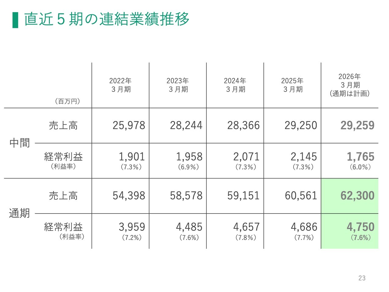 直近5期の連結業績推移です。前述のとおり、今期中間期の連結業績は、売上高が5期連続で増収となったものの、計画段階である程度想定していたとはいえ、経常減益という結果になりました。