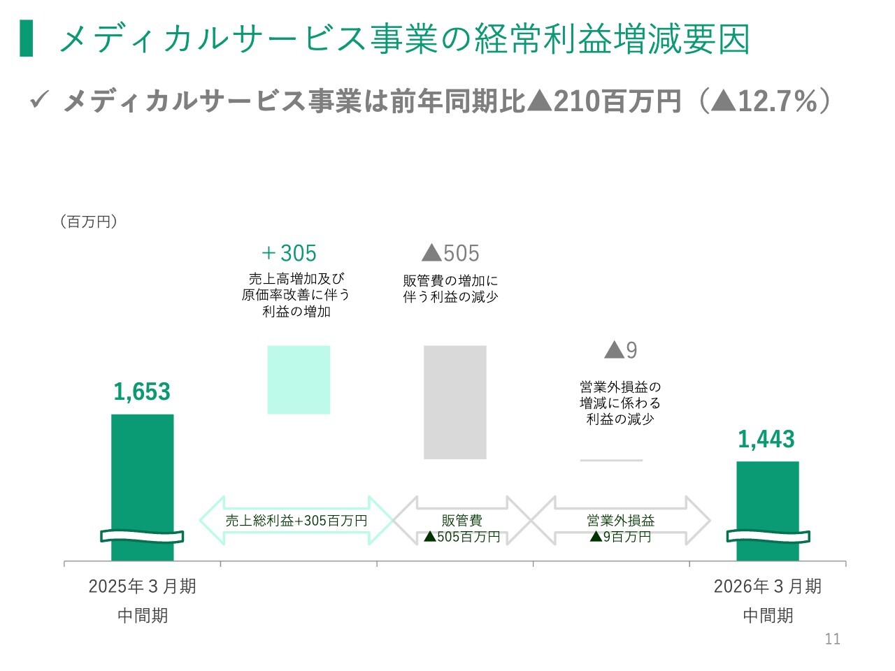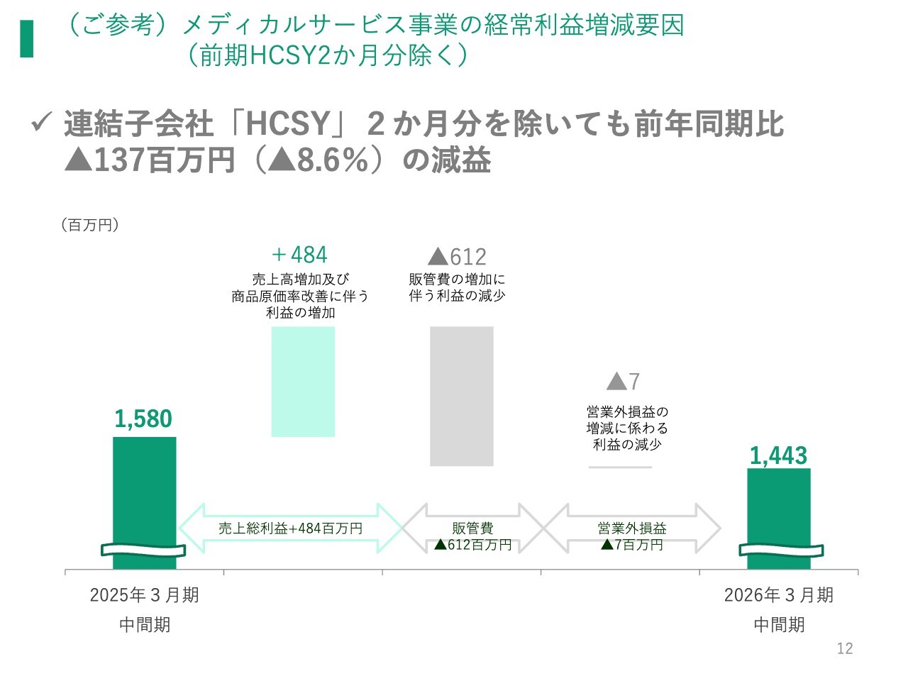 メディカルサービス事業の前期中間期からの経常利益の増減要因です。スライドのグラフは連結子会社の決算期変更の影響を含んでいるため、次ページのスライドでこれを除いた内容をご説明します。
