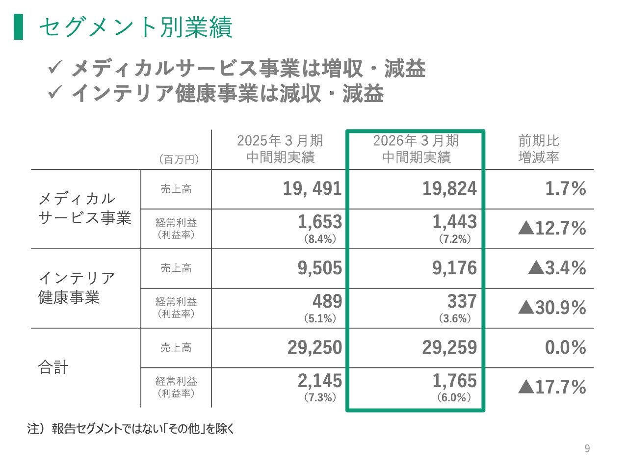 なお、前期より連結子会社ホームケアサービス山口の決算日を10月31日から3月31日に変更しており、前中間期は当該子会社の損益をこれまでより2ヶ月多い8ヶ月分連結しています。この2ヶ月分の影響額は、売上高で4億1,500万円、経常利益で7,300万円となります。
