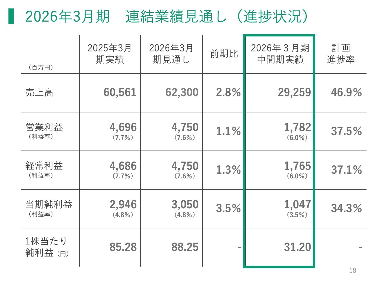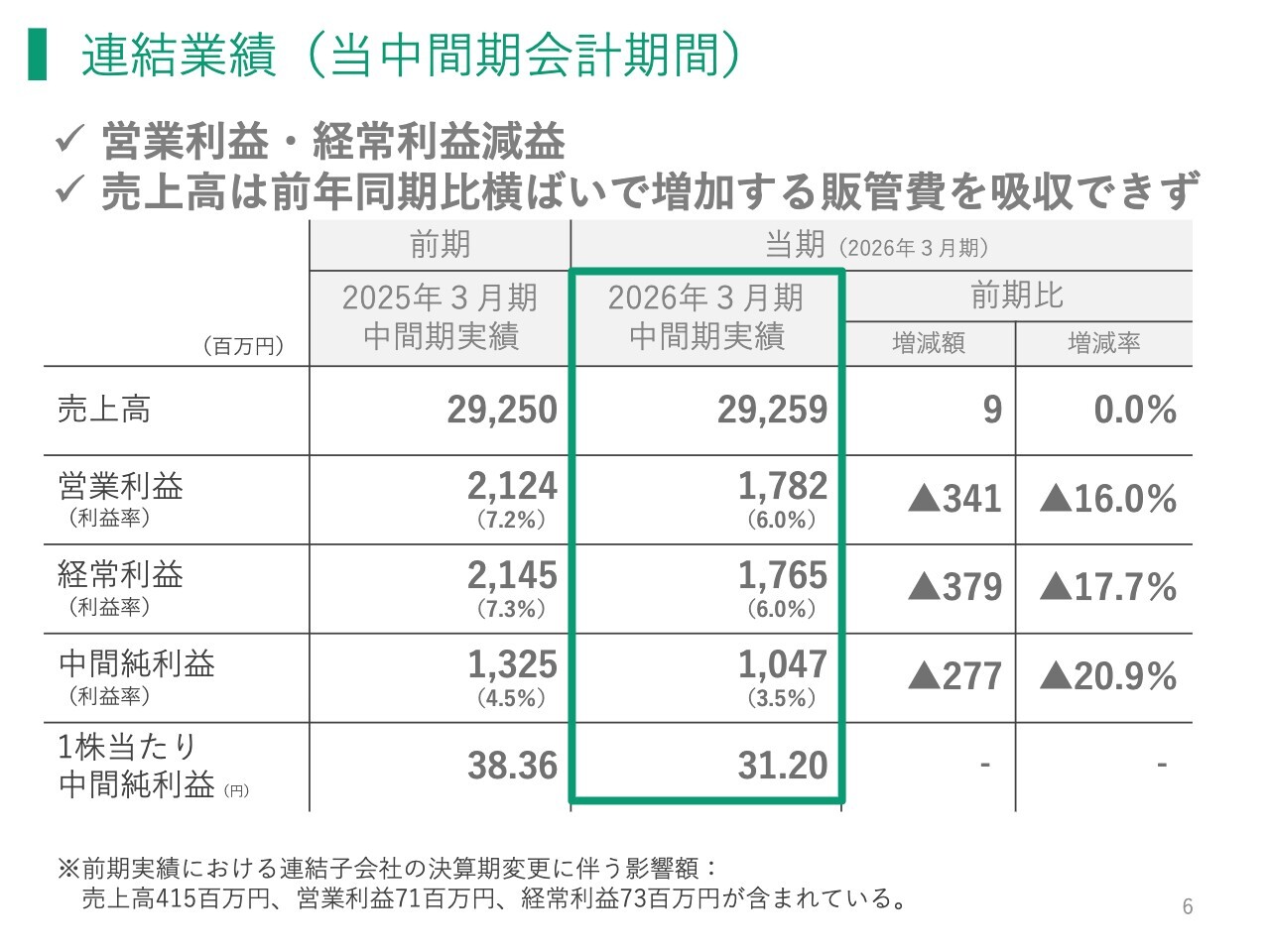 2026年3月期中間期の業績についてご説明します。当中間期の連結業績は、売上高が前期比900万円増の292億5,900万円となりました。経常利益は前期比17.7パーセント減、3億7,900万円減の17億6,500万円、中間純利益は前期比20.9パーセント減、2億7,700万円減の10億4,700万円となりました。
