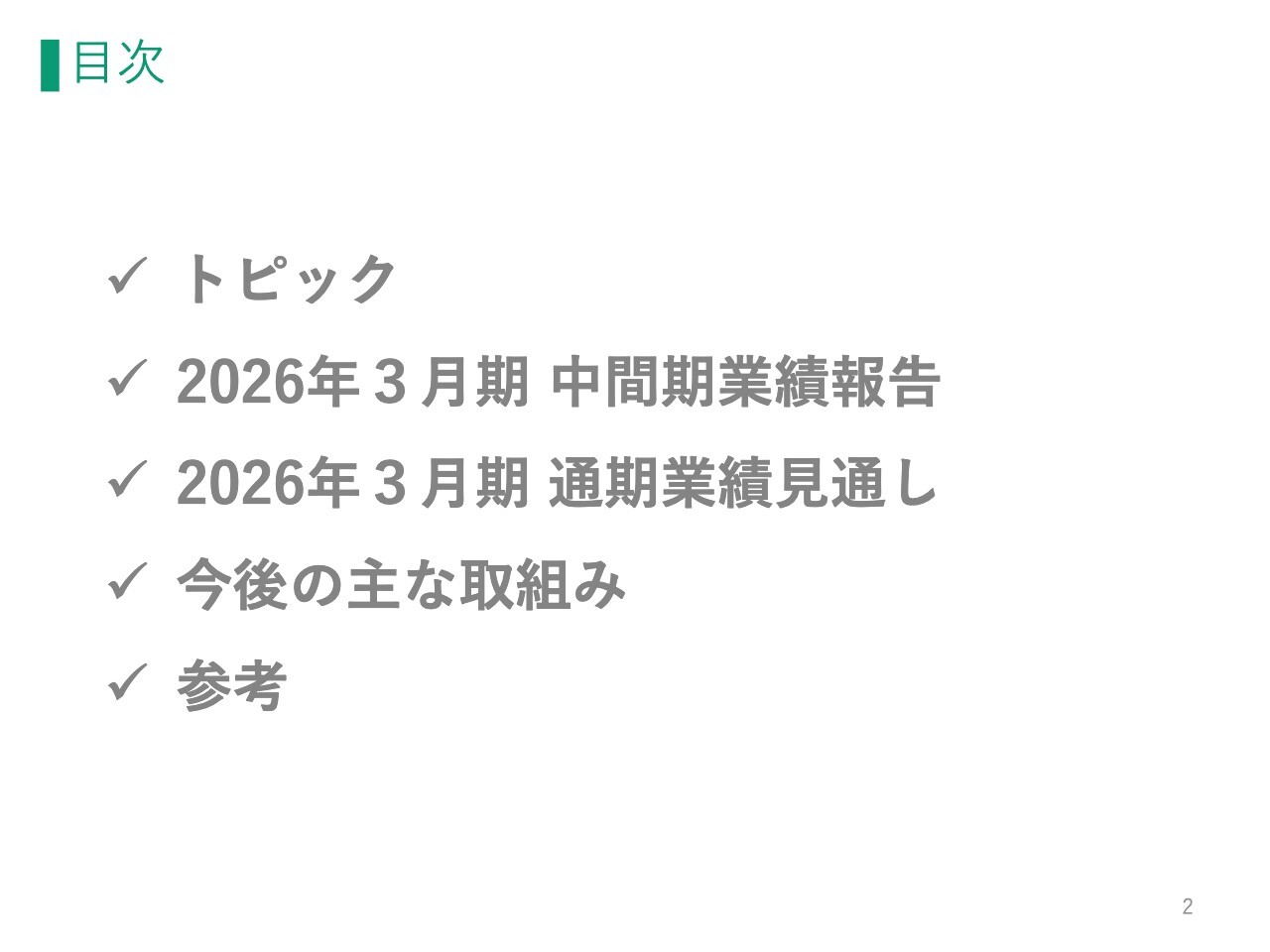 本日の目次はスライドに記載のとおりです。2026年3月期中間期の業績報告および通期業績見通しについては私より、今後の主な取り組みについては社長の池田よりご説明します。