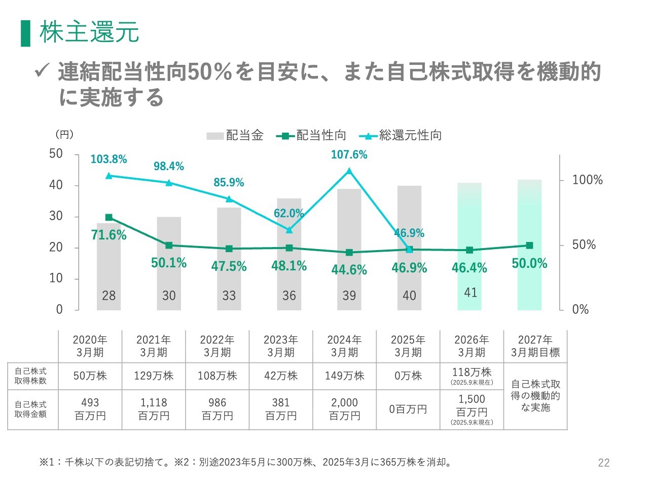 株主還元についてご説明します。配当については、5月15日に公表した内容から変更はありません。連結配当性向50パーセントを目安に、総合的に判断しながら配当水準の向上を目指していきます。