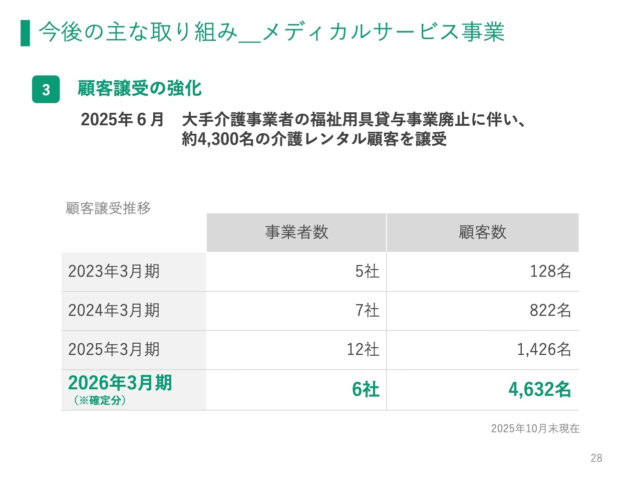 本年6月には、約4,300名の大規模な顧客譲受を完了しました。当社のメイン事業である福祉用具貸与事業の成長のためにも、引き続き顧客譲受に注力していきます。