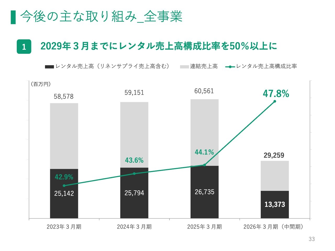 全事業における取り組みについてご説明します。当社グループは、2029年3月までに連結売上高に占めるレンタル売上高比率を50パーセント以上に引き上げることを目標としています。