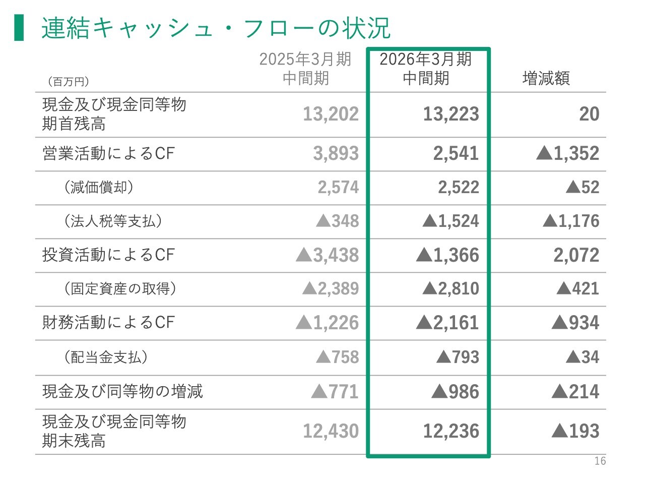 なお、このキャッシュ・フロー計算書上では、現金同等物とみなされない3ヶ月超の短期運用資産は計上されていません。これを加味した実質的な現預金及び有価証券の残高は147億3,600万円となり、期首からの増減額はマイナス24億8,600万円です。