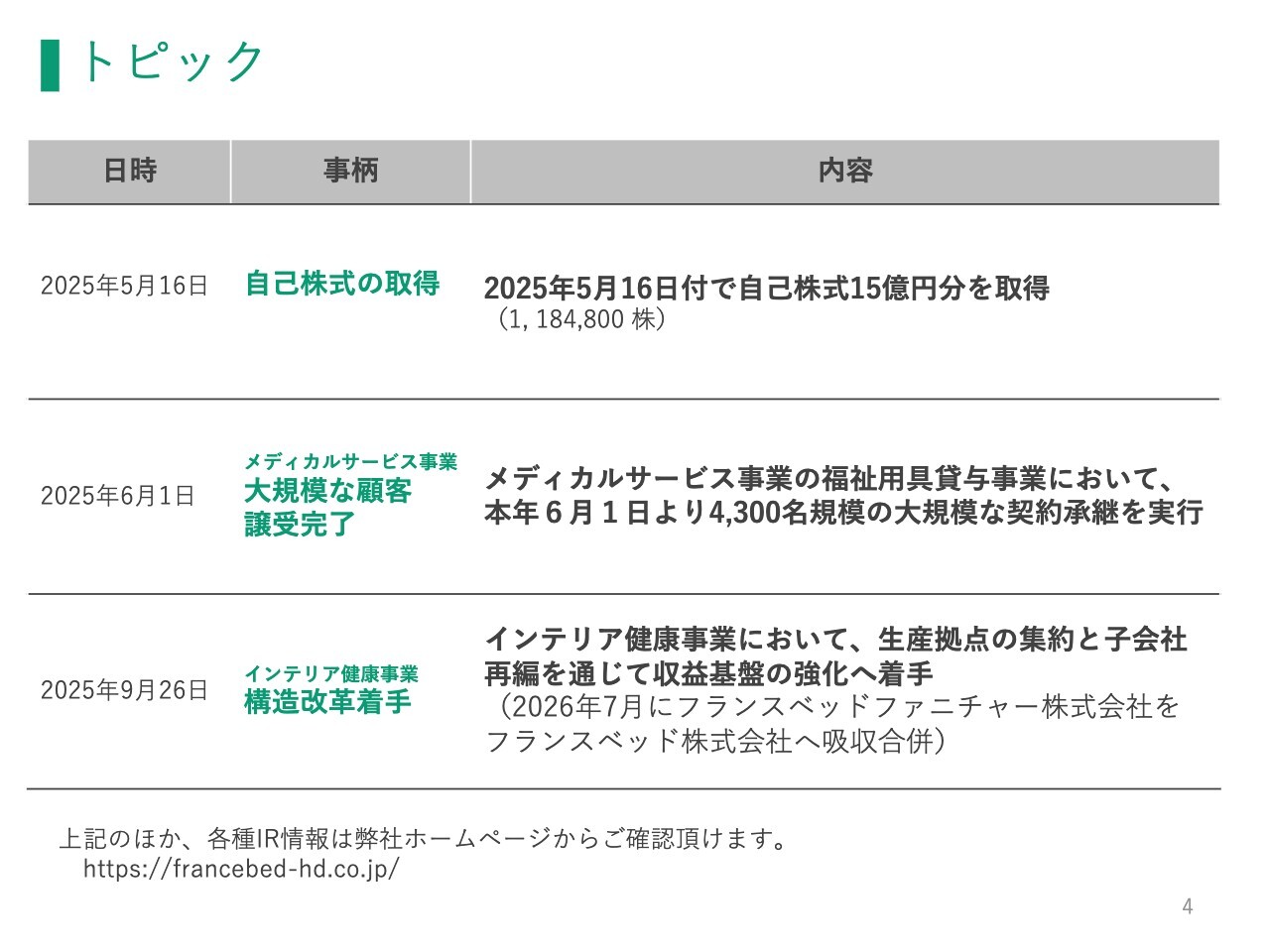 メディカルサービス事業における福祉用具貸与事業では、6月1日に4,300名規模の大規模な顧客承継を実施しました。これにより、事業基盤の拡大と競争力の強化が図られました。