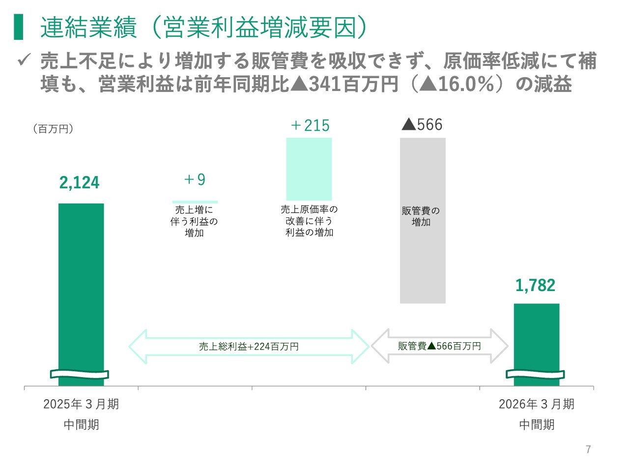 賃上げ等に伴う人件費で約3億円、広告宣伝費や販促費で約1億円、運賃で6,000万円など、あらゆる費用が増加した結果、中間期においてこの費用増を上回る売上を獲得できず、2億7,000万円の減益となっています。