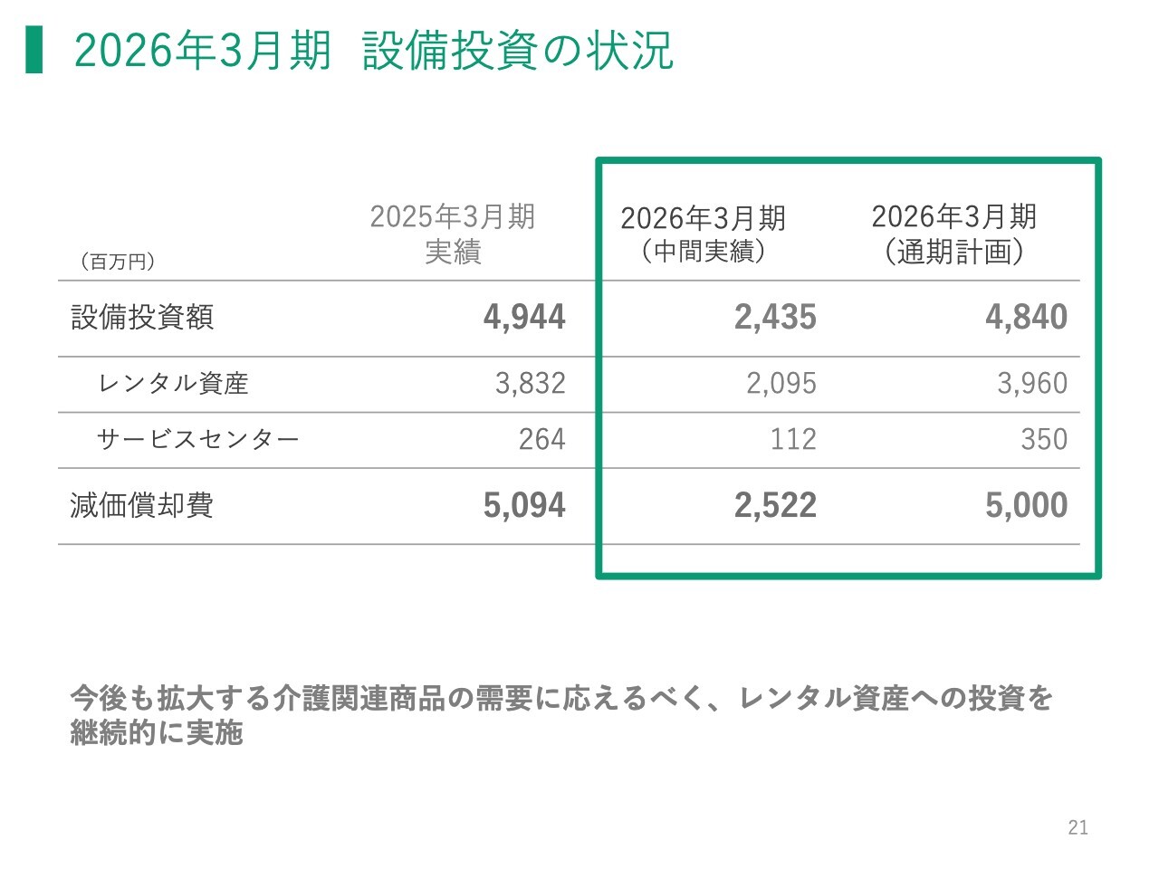 設備投資についてご説明します。2025年9月期中間期の設備投資額は24億3,500万円で、そのうち介護関連レンタル資産への投資は約21億円となりました。