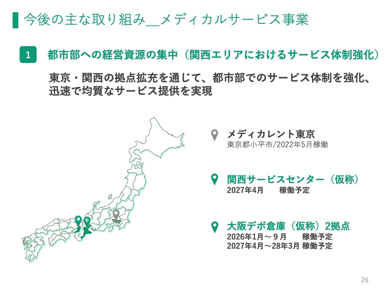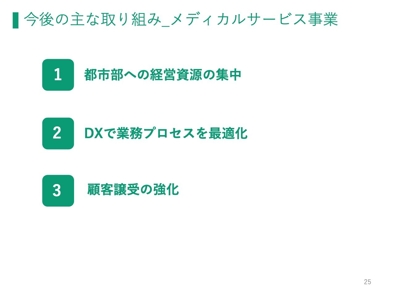 私からは、今後の主な取り組みについてご説明します。メディカルサービス事業の主な取り組みは、スライドに記載の3つです。
