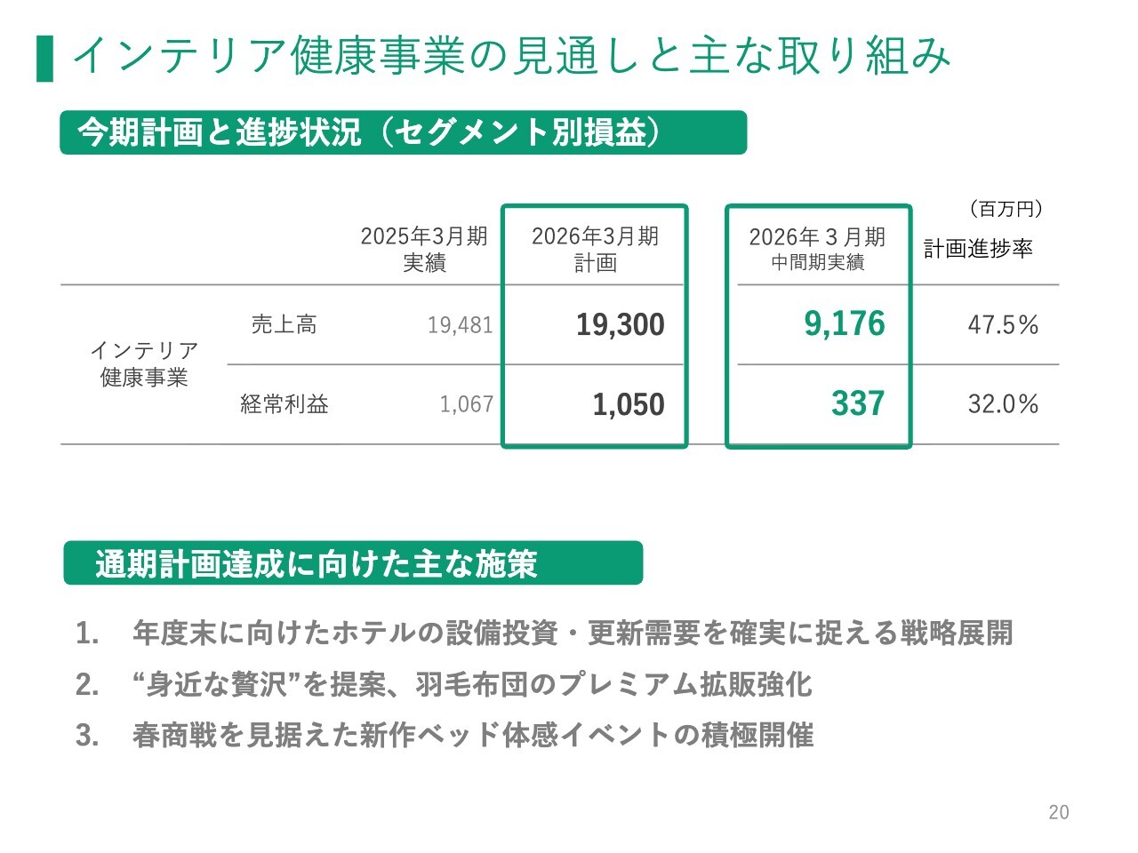 主力商品のベッドについては、中間期ほどではないものの、家具店への来店客数が依然として減少している状況を踏まえ、催事回数を増やして対応しています。加えて、3月の春需要に向け、11月発表の新作商品を多くのお客さまに体感・購入していただけるよう努めています。