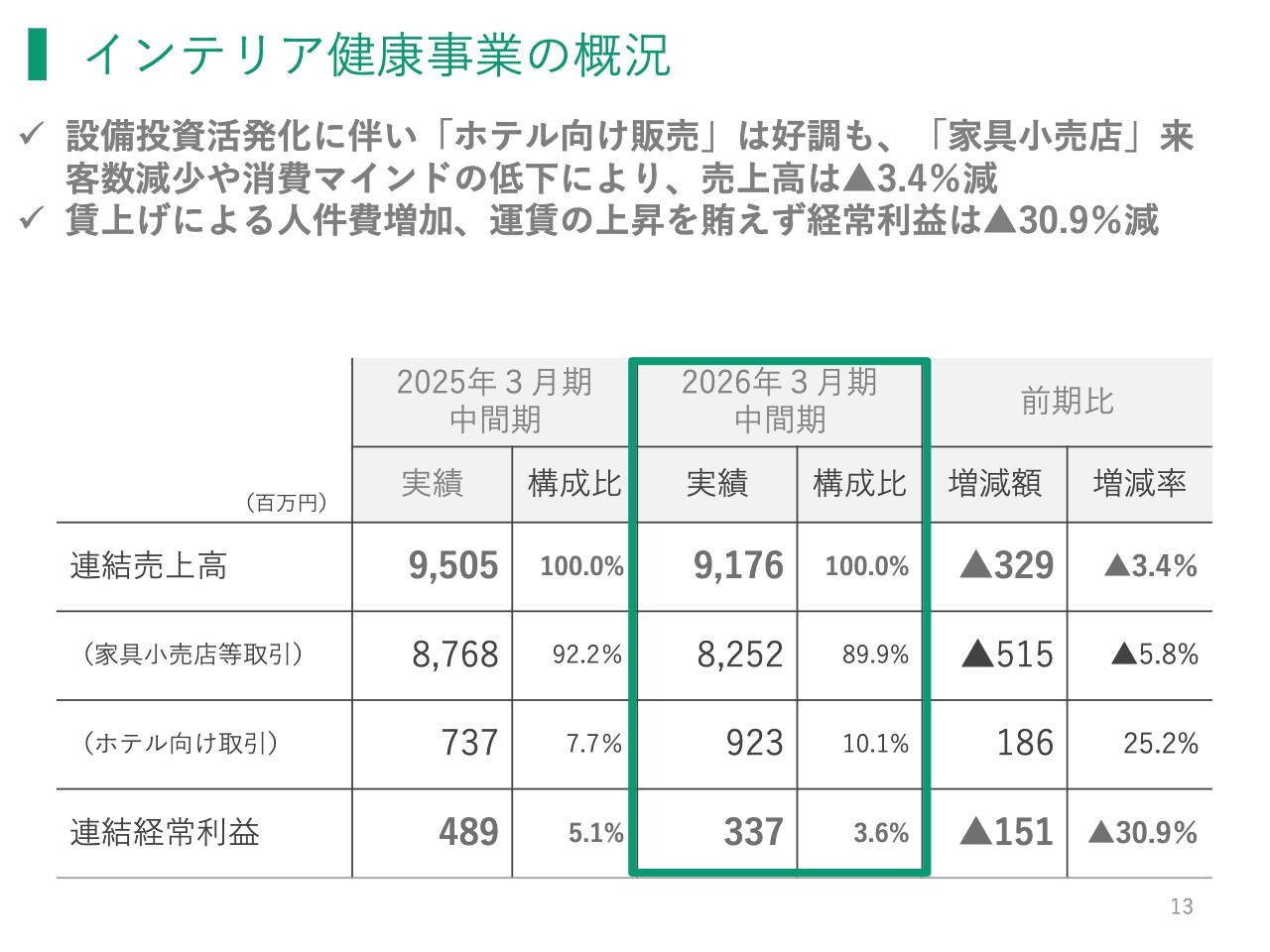 インテリア健康事業は、売上高が前期比3.4パーセント減少しました。経常利益は前期比30.9パーセント減、1億5,100万円減の3億3,700万円となりました。