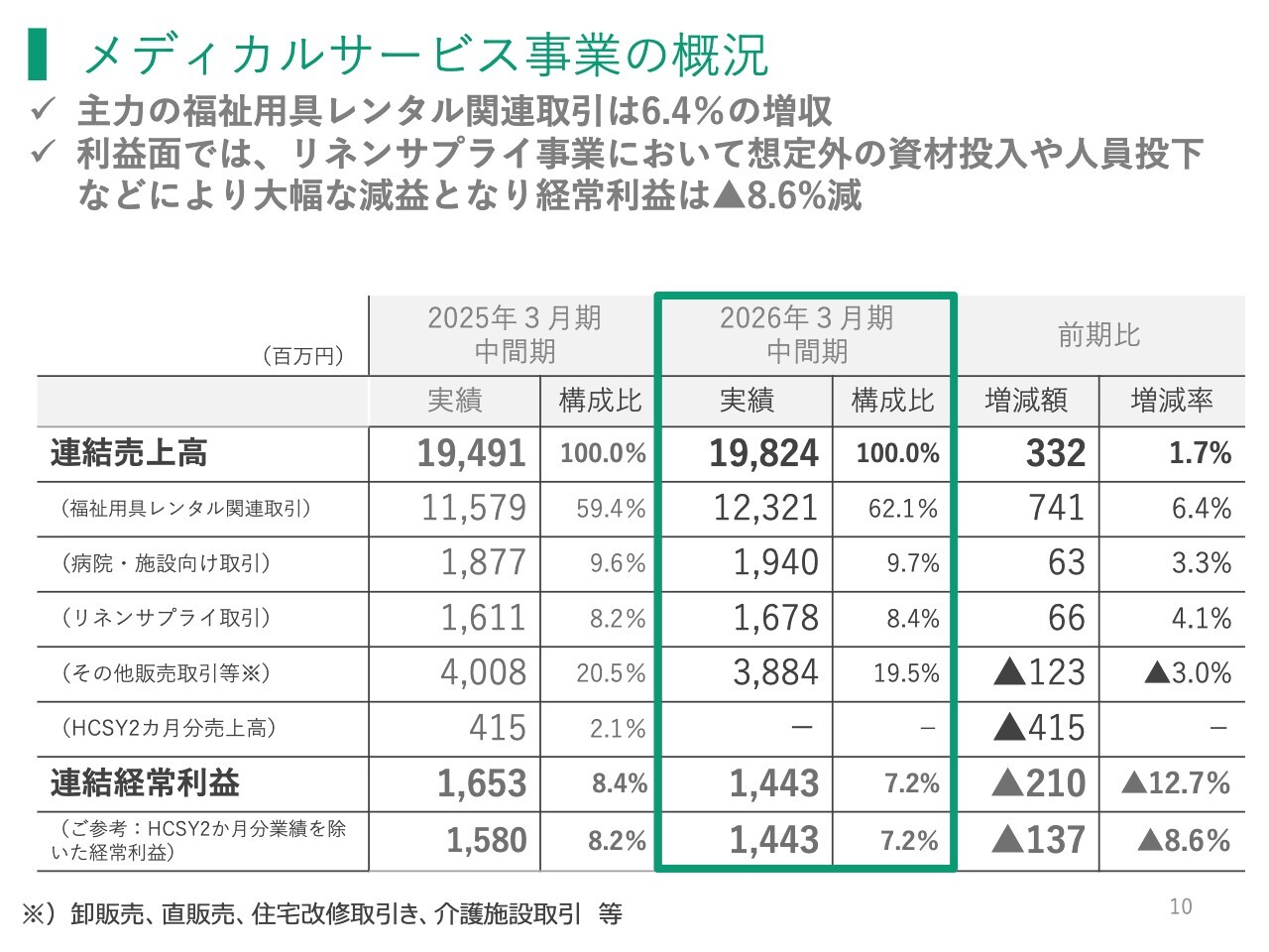 メディカルサービス事業の内訳です。売上高については、福祉用具レンタル、病院・施設向け、リネンサプライといった主要区分のいずれも増収となりました。